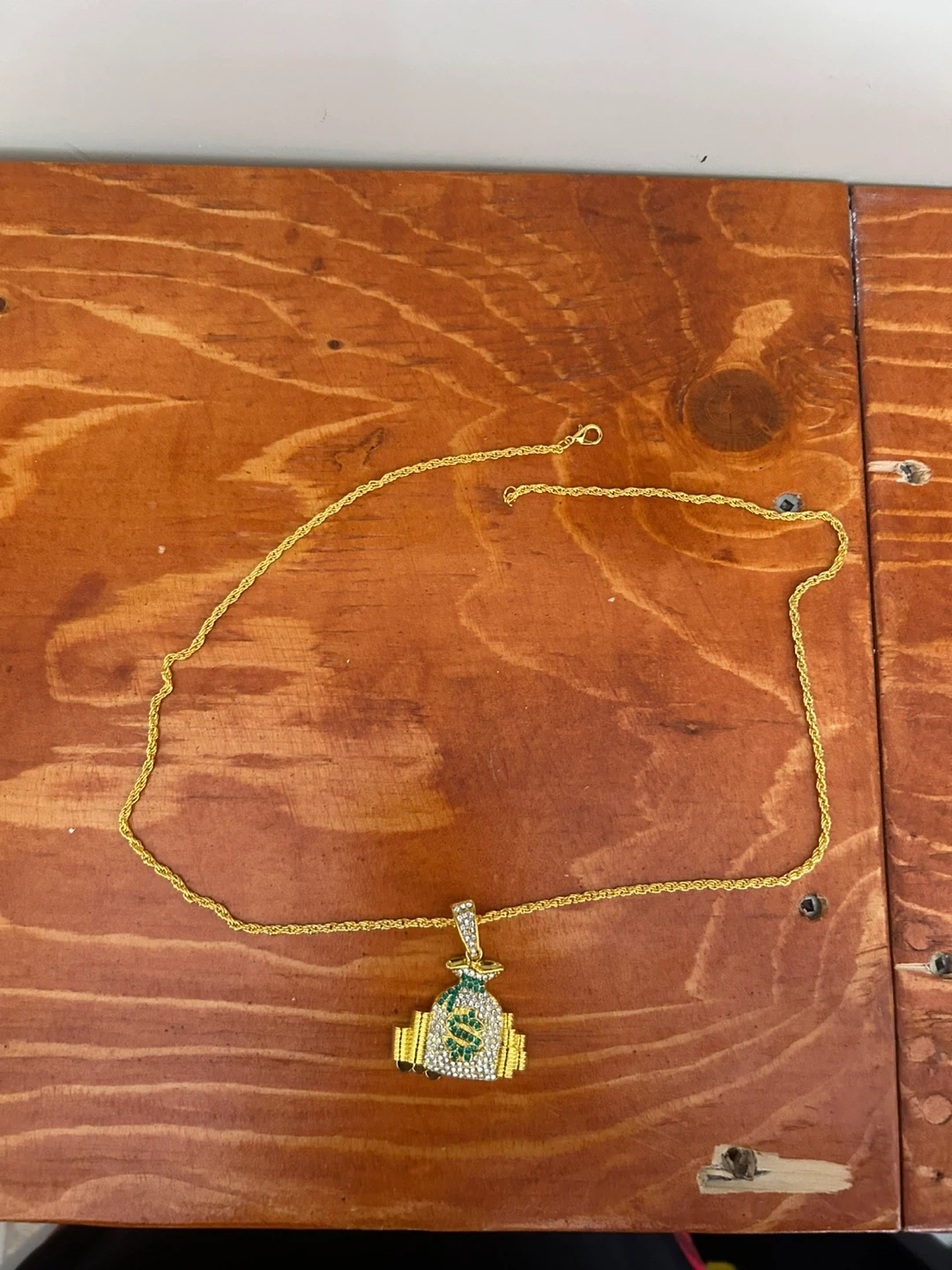 Gold tone rope chain necklace with a detailed money bag pendant. It features green and clear cubic zirconia stones. This necklace is a statement piece for any jewellery collection.