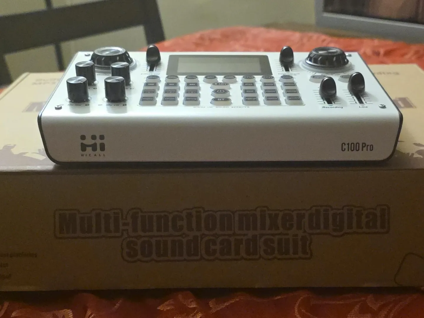 This is a HICALL C100 Pro multi-function mixer and digital sound card suit. It's white and includes various controls and buttons for audio mixing. This unit is designed for professional audio applications.