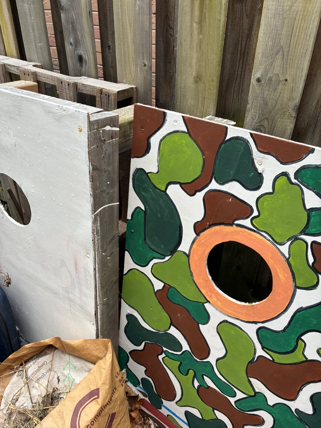 Selling a handmade cornhole game set. One board is painted white and the other features a camouflage design. Perfect for outdoor fun!