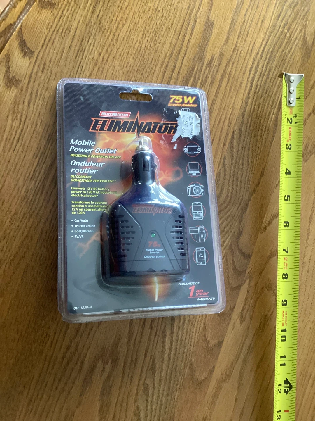 This Motomaster Eliminator 75W mobile power outlet converts 12V DC battery power to 120V AC household electrical power. It's designed for use in cars, trucks, boats, and RVs. The unit comes in its original packaging.