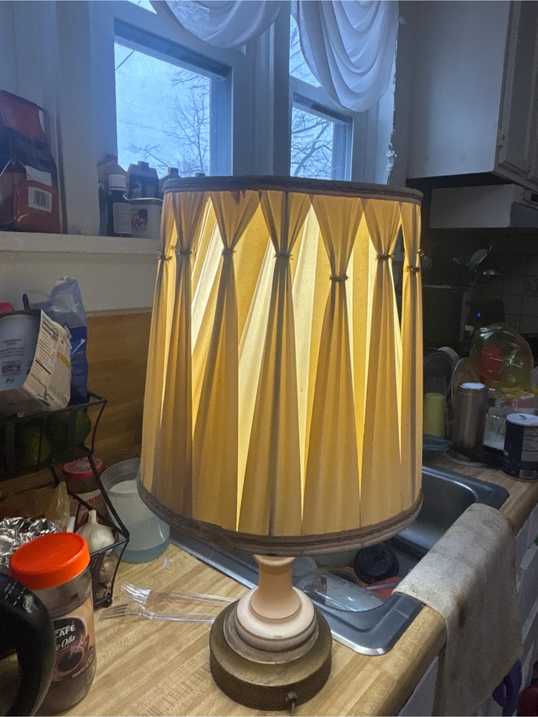 This is a vintage table lamp with a decorative floral design on the frosted glass base. It features a pleated fabric lampshade in a warm, muted yellow tone. The lamp has a unique, ornate base with a brushed metal finish.