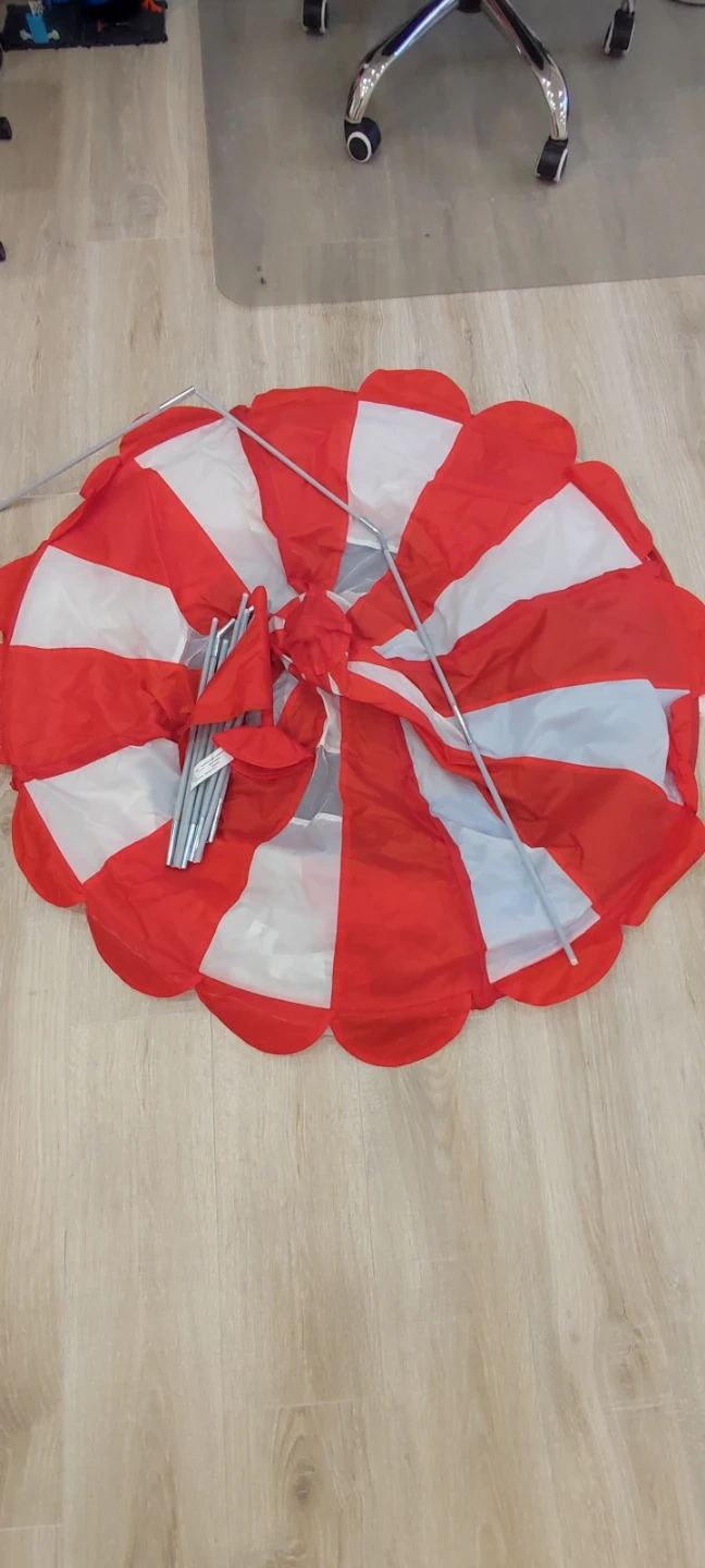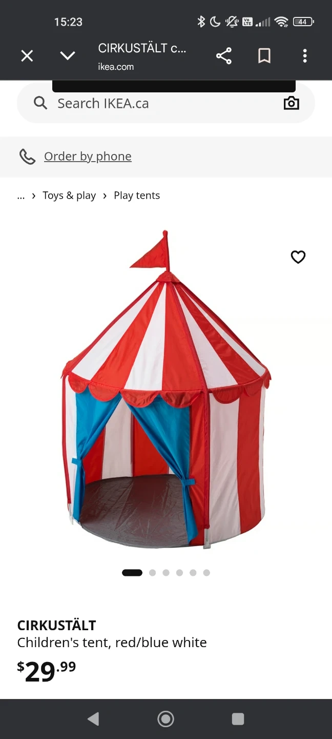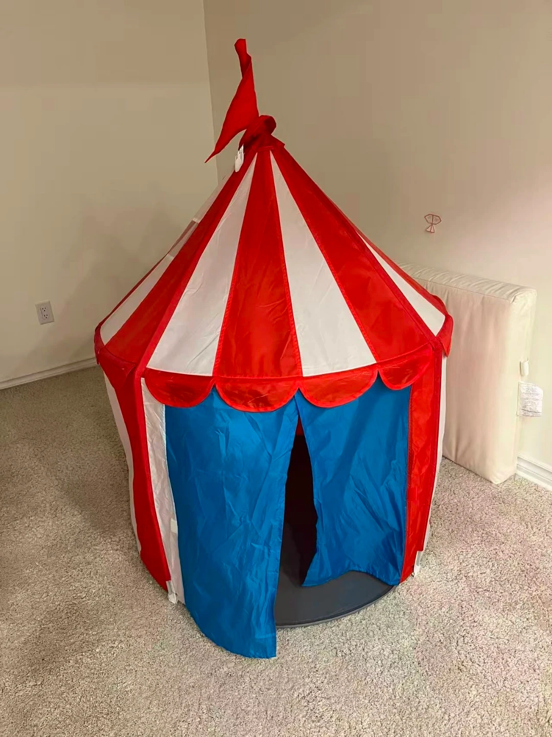 This is the IKEA CIRKUSTÄLT children's tent. It's red, blue, and white. It includes the poles and fabric components.