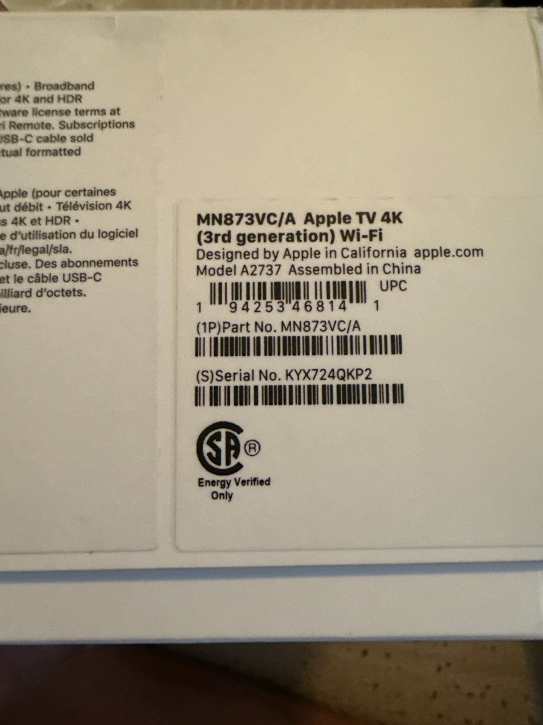 Apple TV 4K streaming device. 3rd generation. 64GB of storage. Wi-Fi connectivity. Includes box and device.