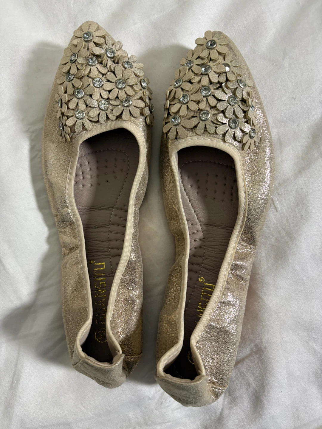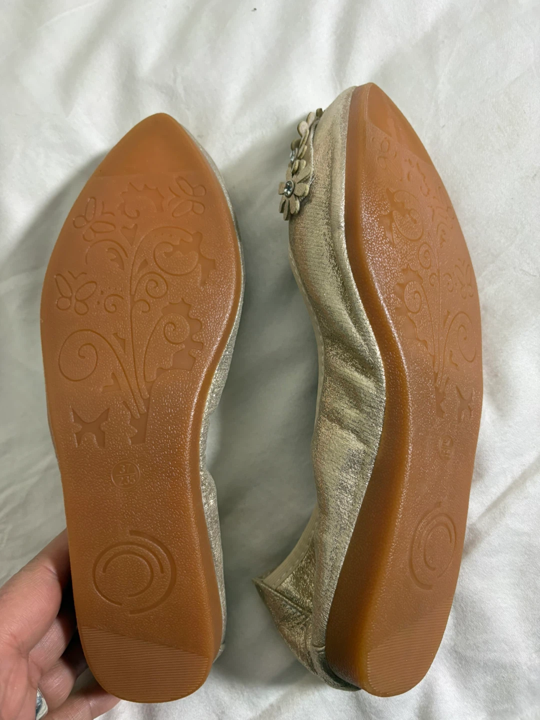 1 / 51 / 5Buy & SellGold Ballet Flats Size 37 / 235Gold Ballet Flats Size 37 / 235$10These gold ballet flats feature a floral design with rhinestones on the toe. The size is 37 (235). They're a slip-on style with a flexible sole.ConditionNewBrandGUANSITUWHERE TO MEET99 Marble Hill AveView MapSELLERverifiedclaudiaMarble Hill1034 reviews0 chats·0 favorites·2 viewsSEND CHAT TO SELLERHi claudia! I’m interested in your listing.Hi claudia! I’m interested in your listing.Get the Karrot app to chatSign In to chat