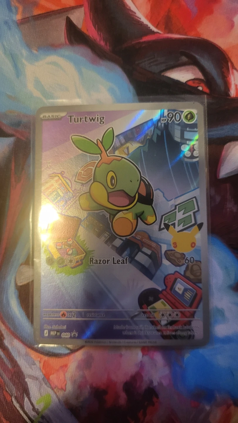 This is a holographic Turtwig trading card from Pokemon. It has 90 HP and features the "Razor Leaf" attack. It's a basic Grass-type Pokemon.