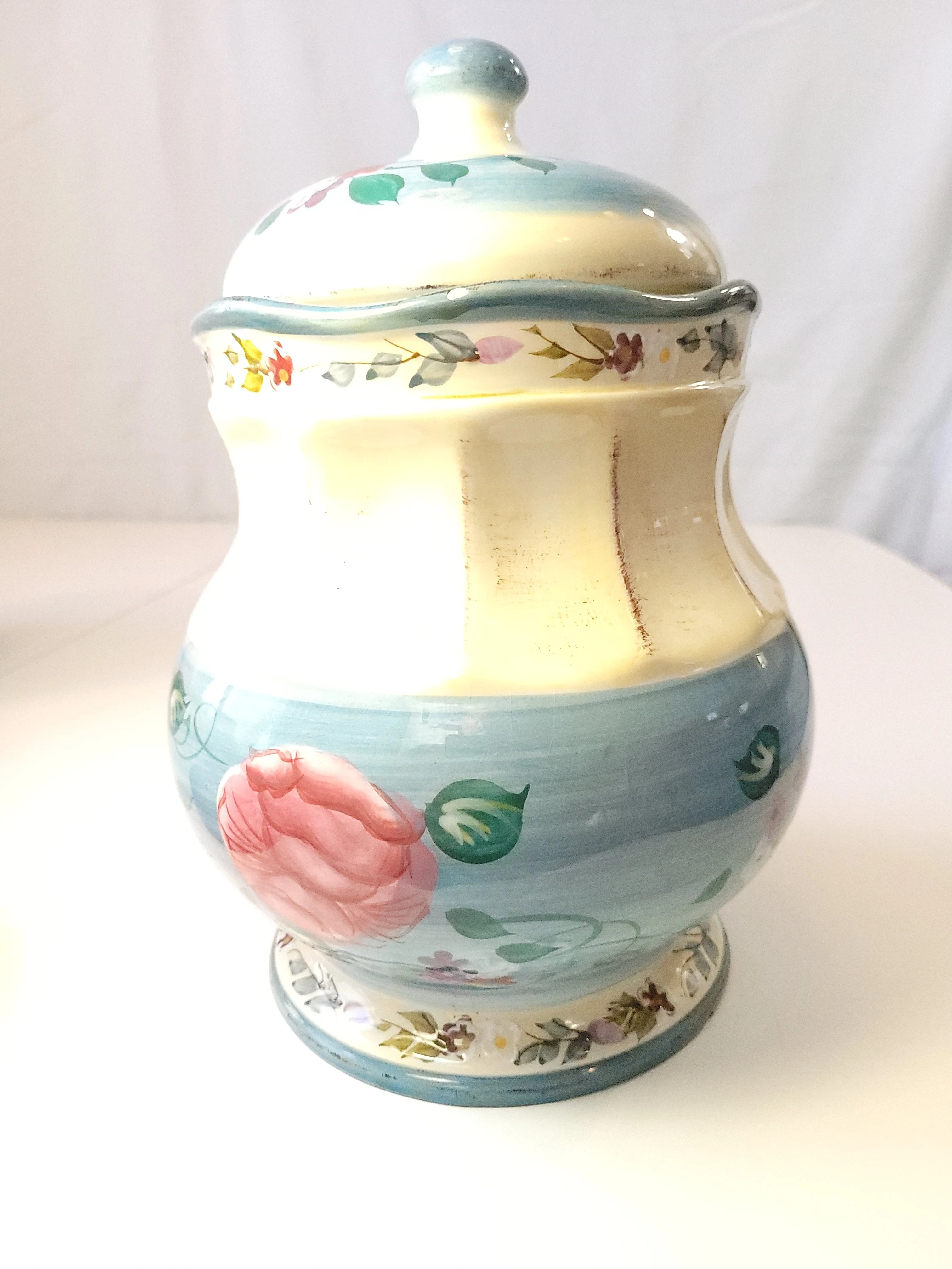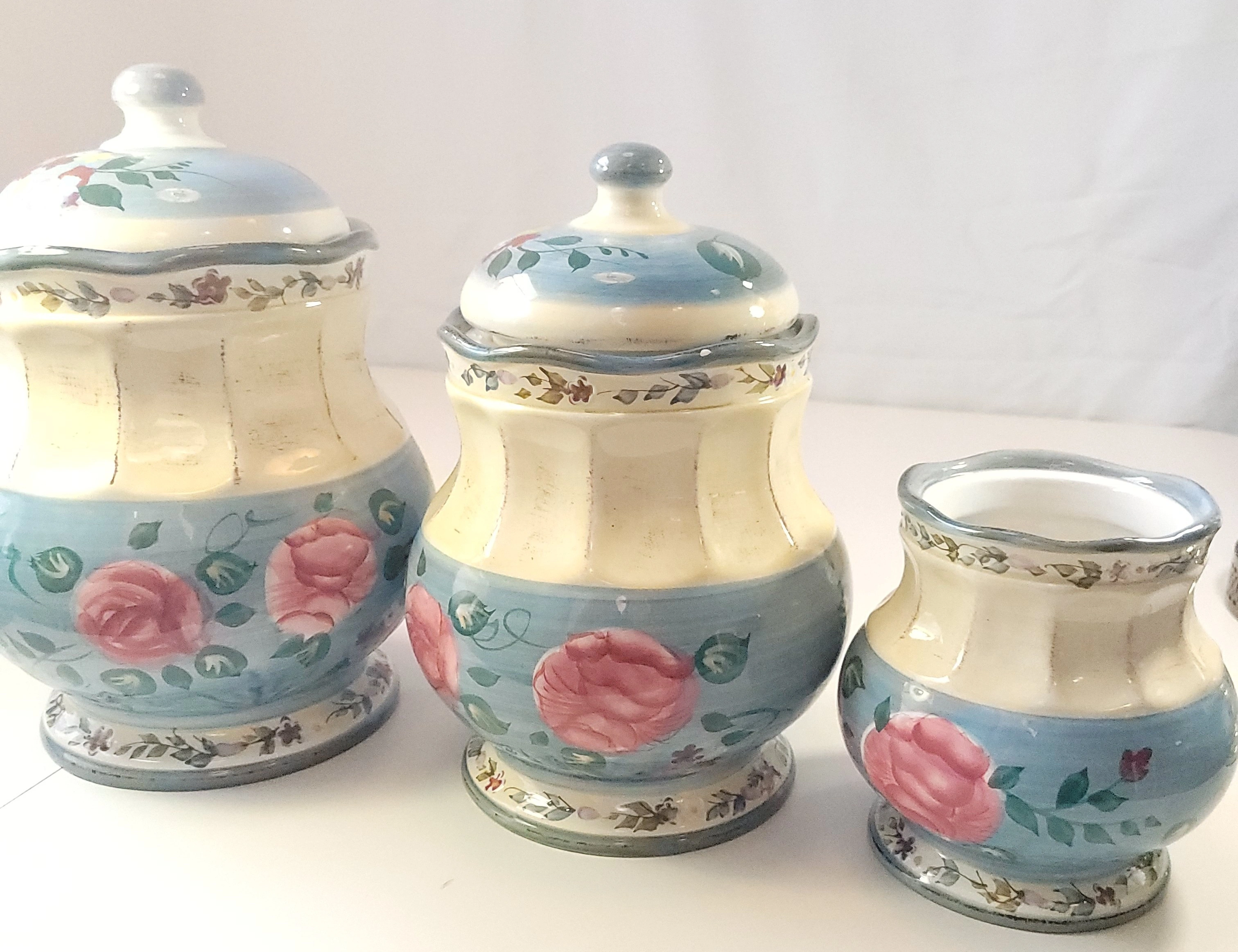 A beautiful addition to any farmhouse or shabby chic kitchen. This set features embossed vertical ribbing, a creamy ivory body, and soft blue accents with hand-painted pink roses and floral sprays.