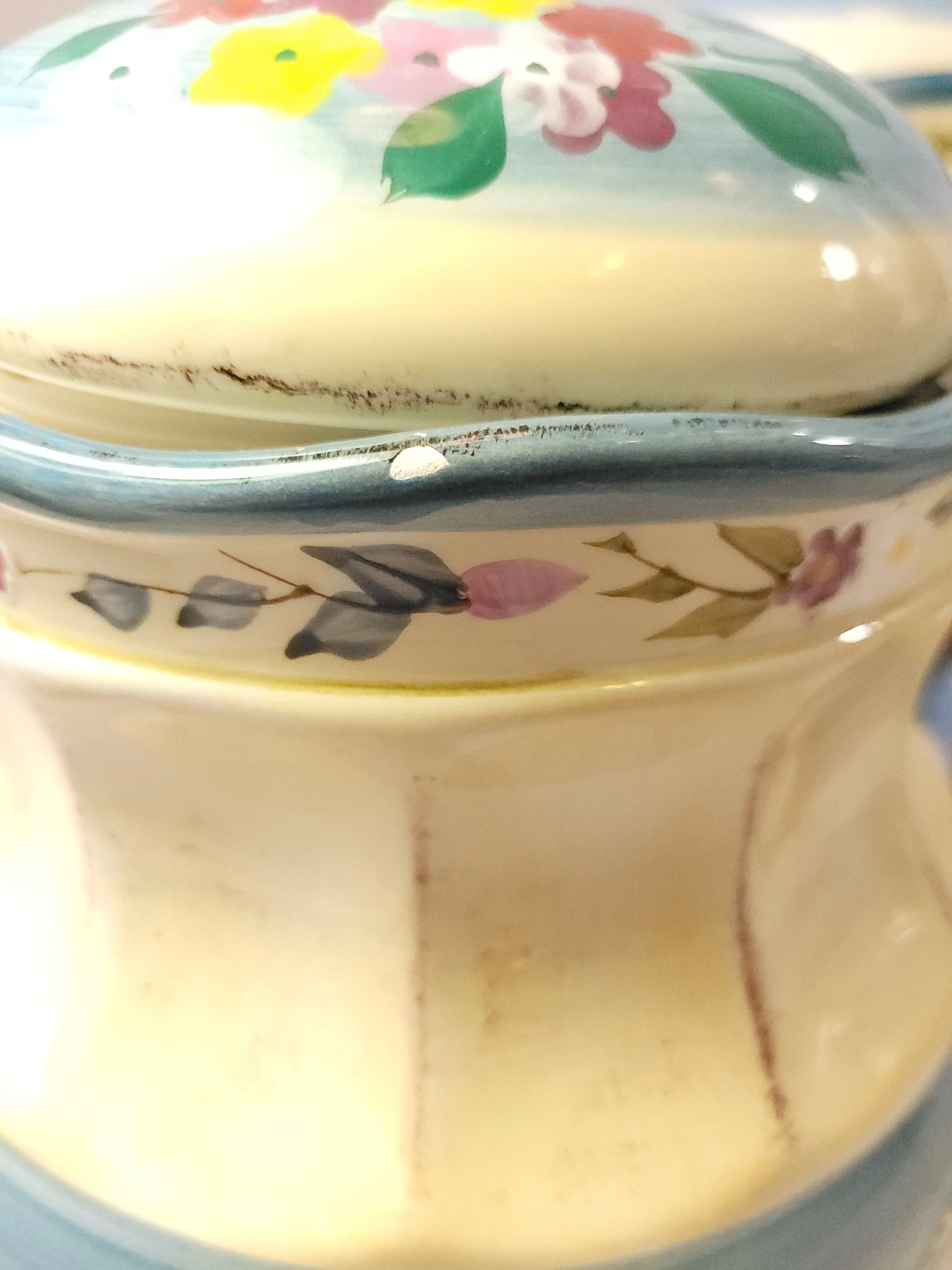 Large Canister: Notable chip on the underside of the top rim (see photos). It is partially hidden when the lid is seated but is present.