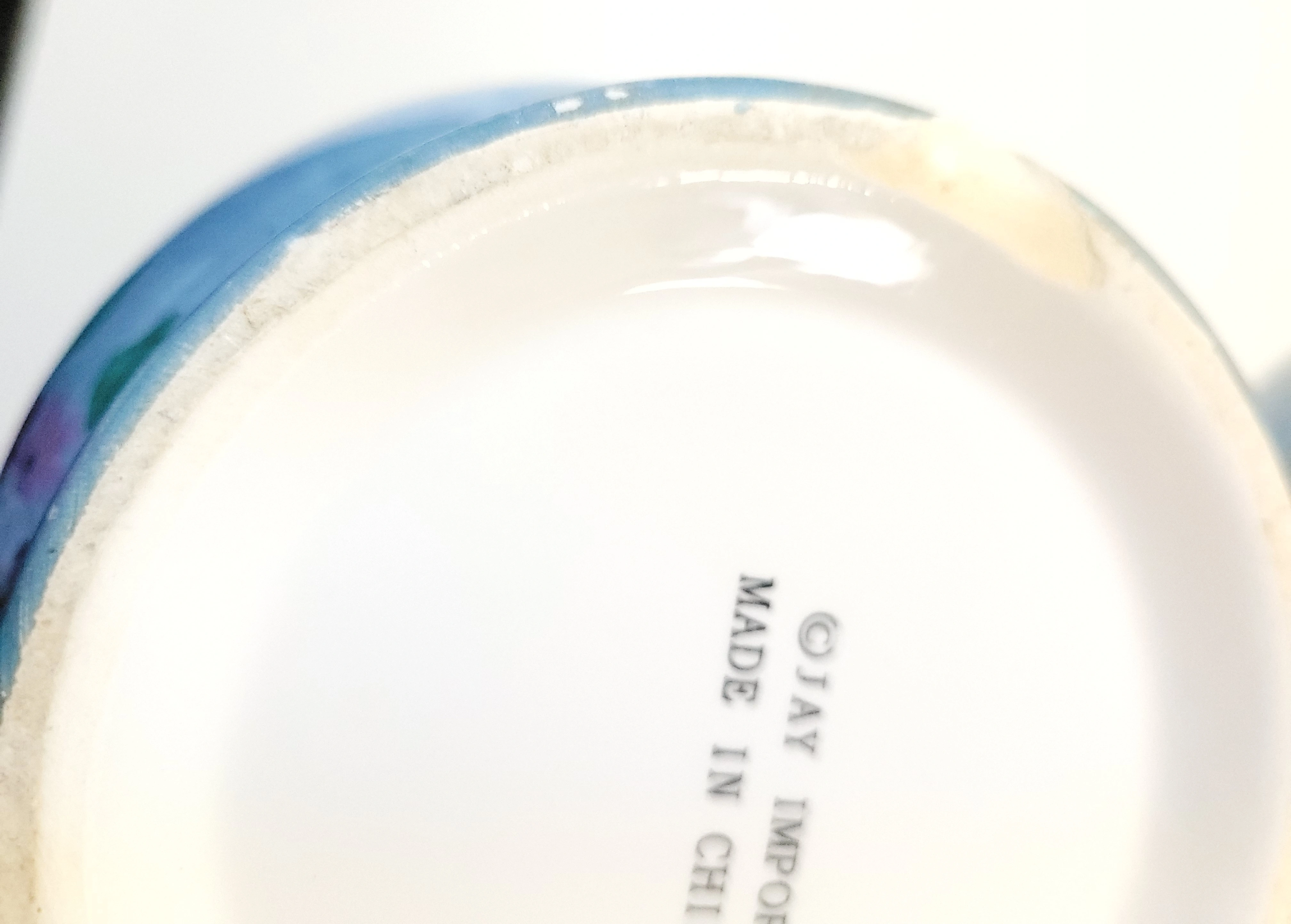 General: Minor "flea bites" (tiny glaze nicks) on the inner rims and light shelf wear on the bases consistent with age.