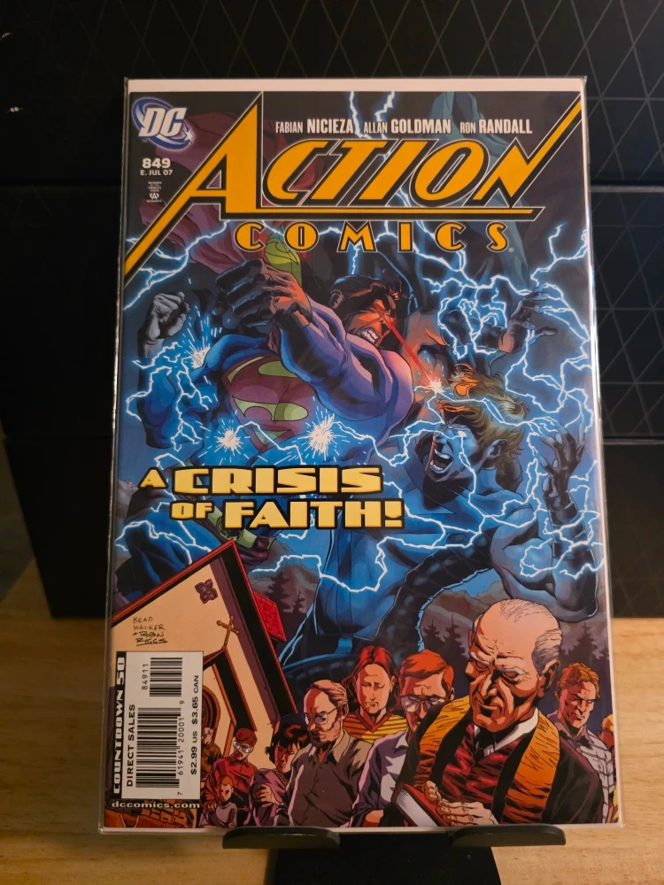 Selling Action Comics #849, featuring the story 'A Crisis of Faith!' This comic is a direct sales edition from DC Comics. Cover art by Fabian Nicieza, Allan Goldman, and Ron Randall. Get this issue from July 2007!