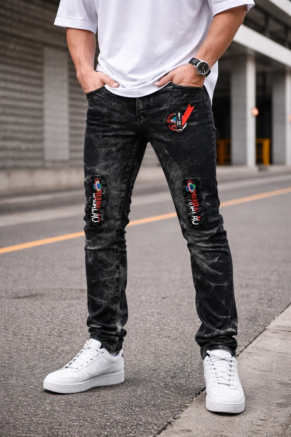 Designed with a stylish black washed finish, ripped details, and eye-catching embroidered patches, these slim-fit jeans hug perfectly and bring that clean streetwear vibe. Once you put them on, don’t be surprised if everyone asks where you got them from.