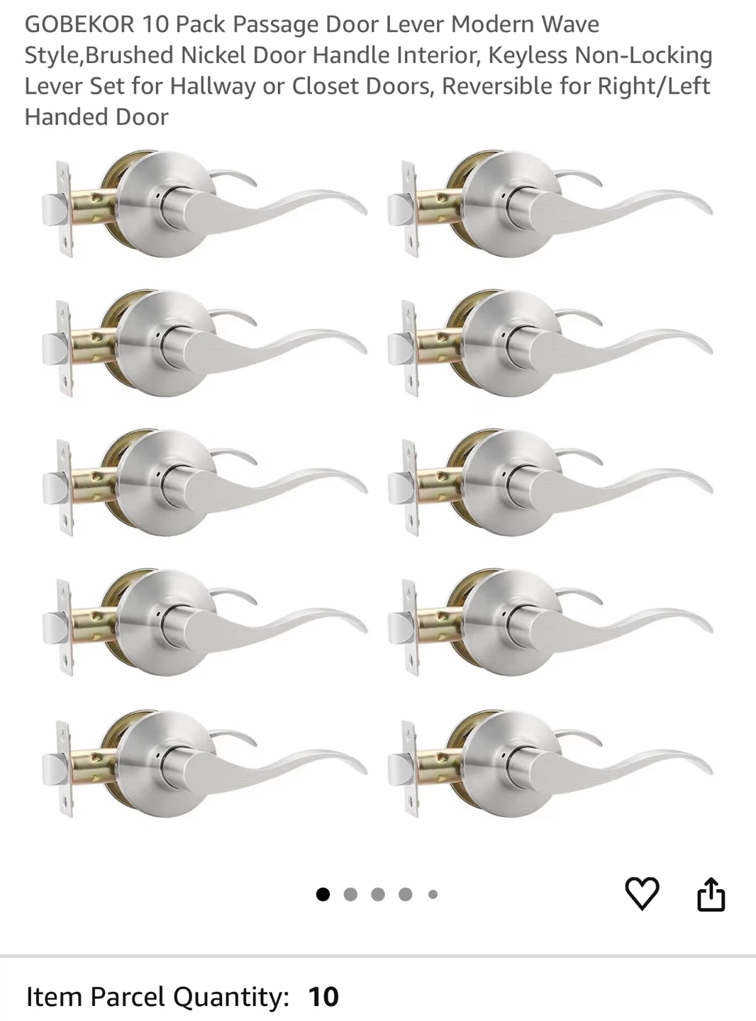 This is a 10-pack of GOBEKOR door levers. They feature a modern wave style in brushed nickel. Each lever is reversible for right or left-handed doors. The set includes stainless steel latches and a strong construction for durability.