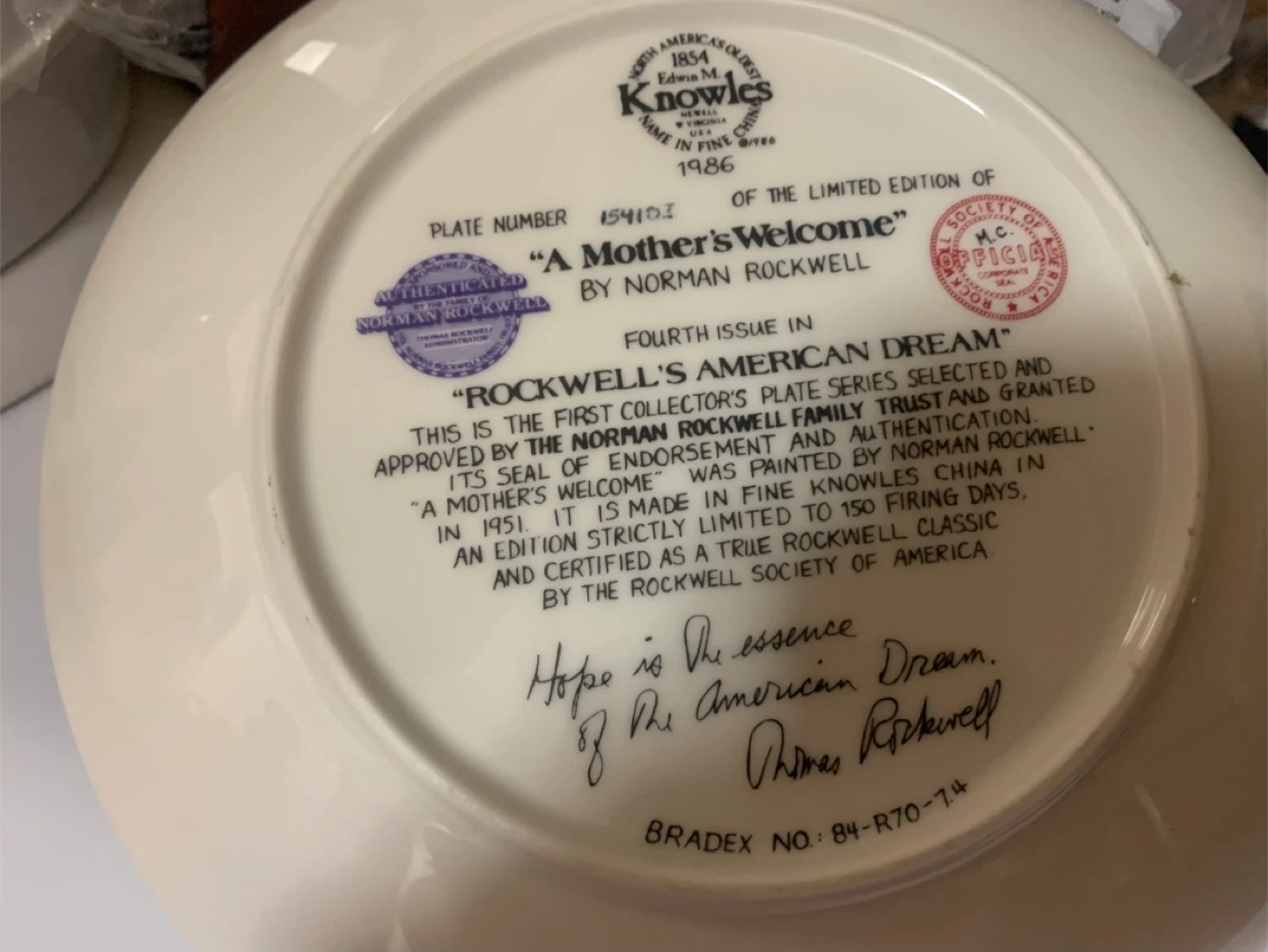 This is the fourth issue in the "Rockwell's American Dream" series, "A Mother's Welcome." It's the first collector's plate series selected and approved by the Norman Rockwell Family Trust. Made in fine Knowles China in 1951.