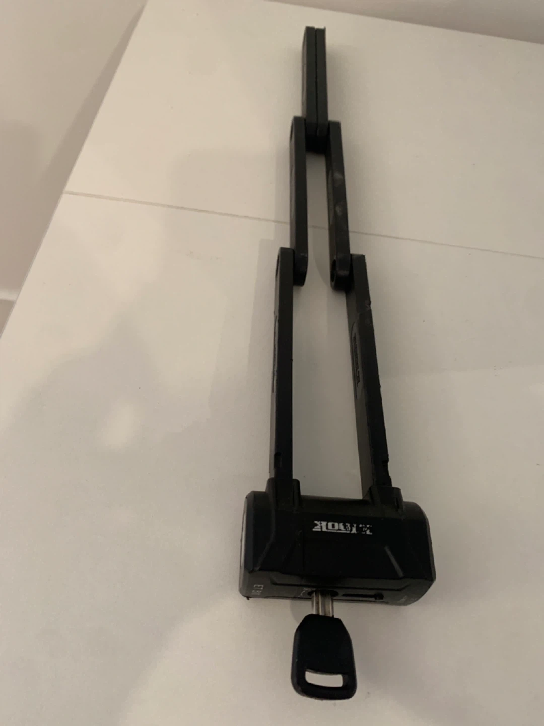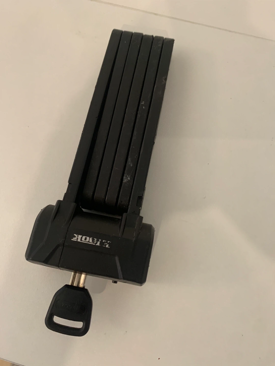 This is an ETook ET510 folding bike lock. It's made from a series of 5mm thick steel plates. It folds down into a compact package for easy carrying. Good condition. Regular $99 plus tax. Comes with two keys