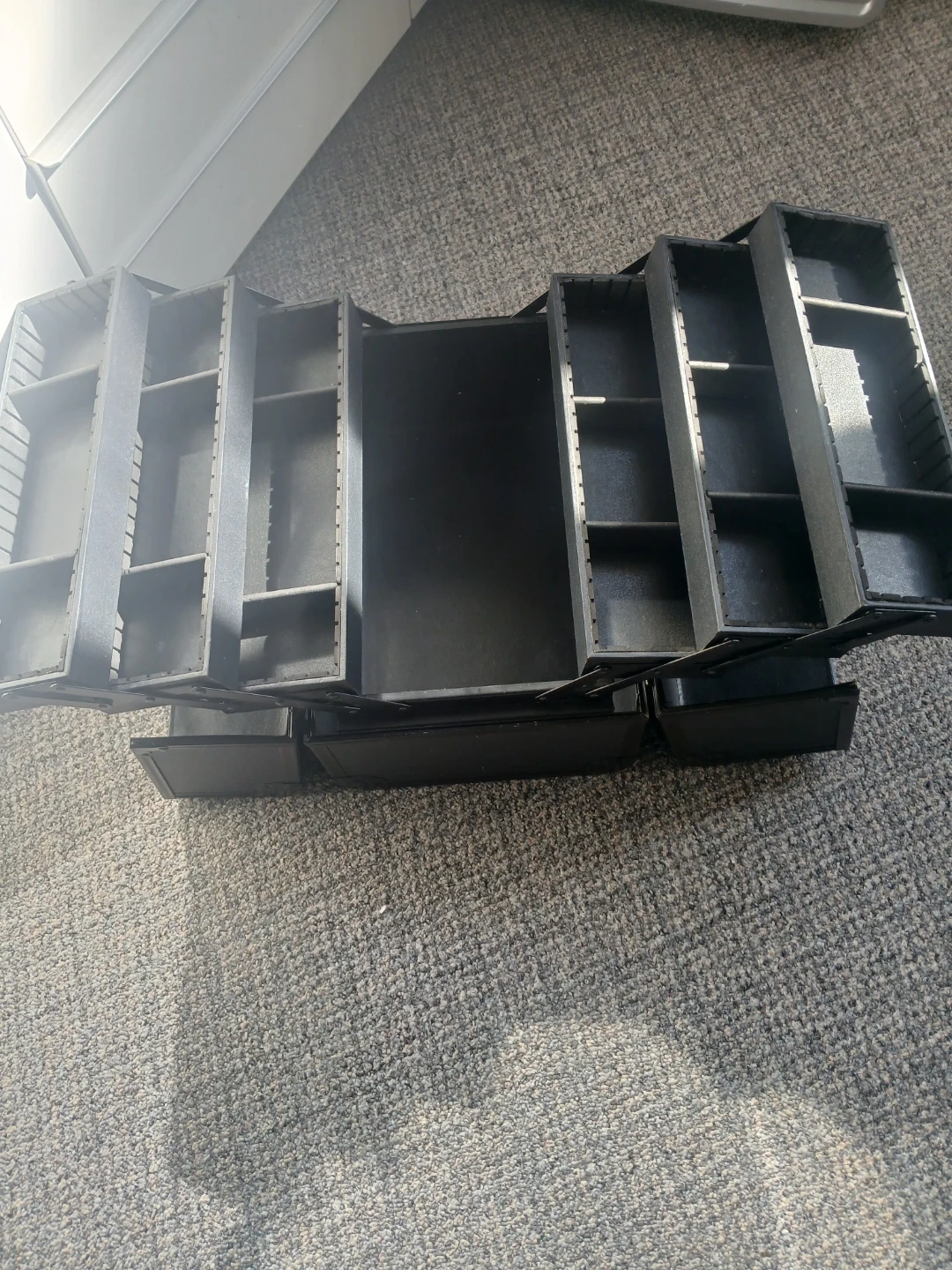 This is a black makeup train case with multiple compartments for organizing cosmetics and beauty supplies. It has a sturdy handle and latches for secure closure. This case is great for travelling or for storing your makeup collection.