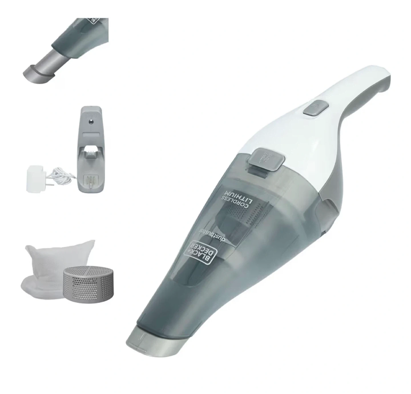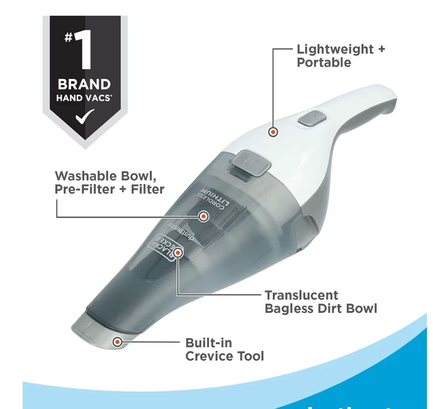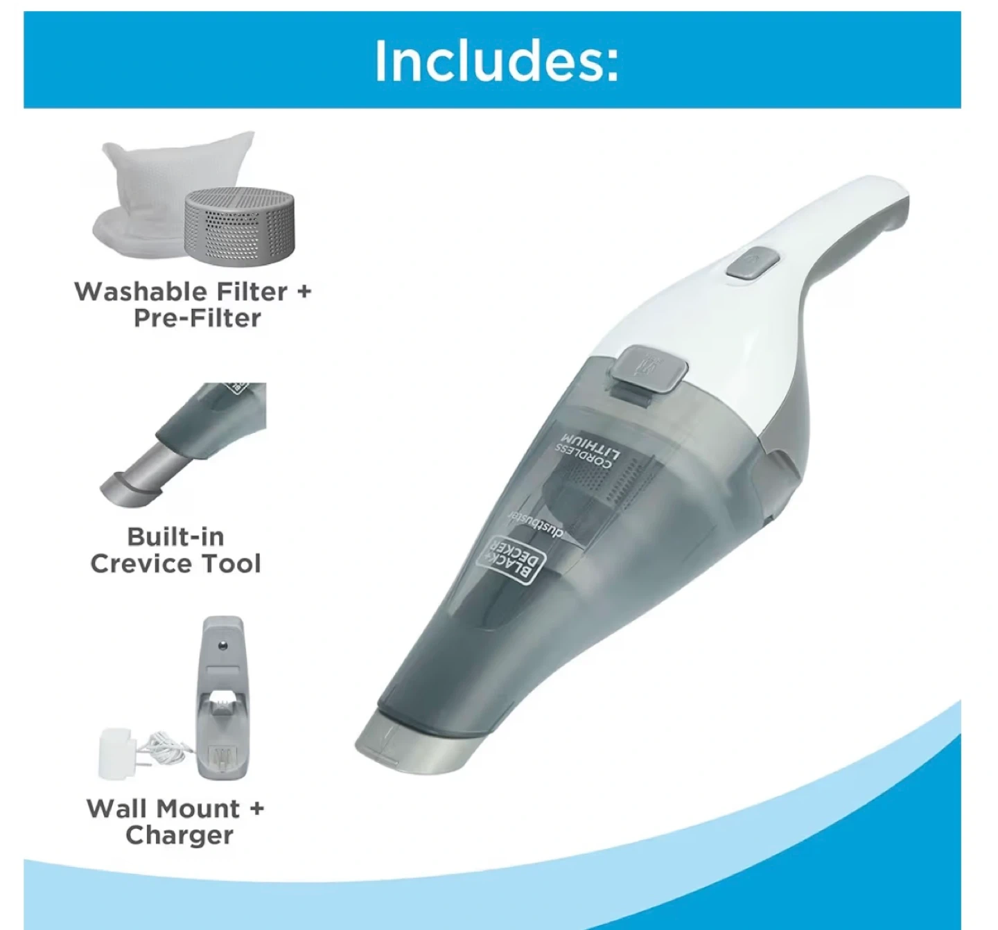 This is a BLACK+DECKER cordless handheld vacuum. It's powered by lithium-ion battery and features a translucent, bagless dirt bowl. It includes a washable filter, pre-filter, built-in crevice tool, and a wall mount with charger. Lightweight and portable for quick cleanups!