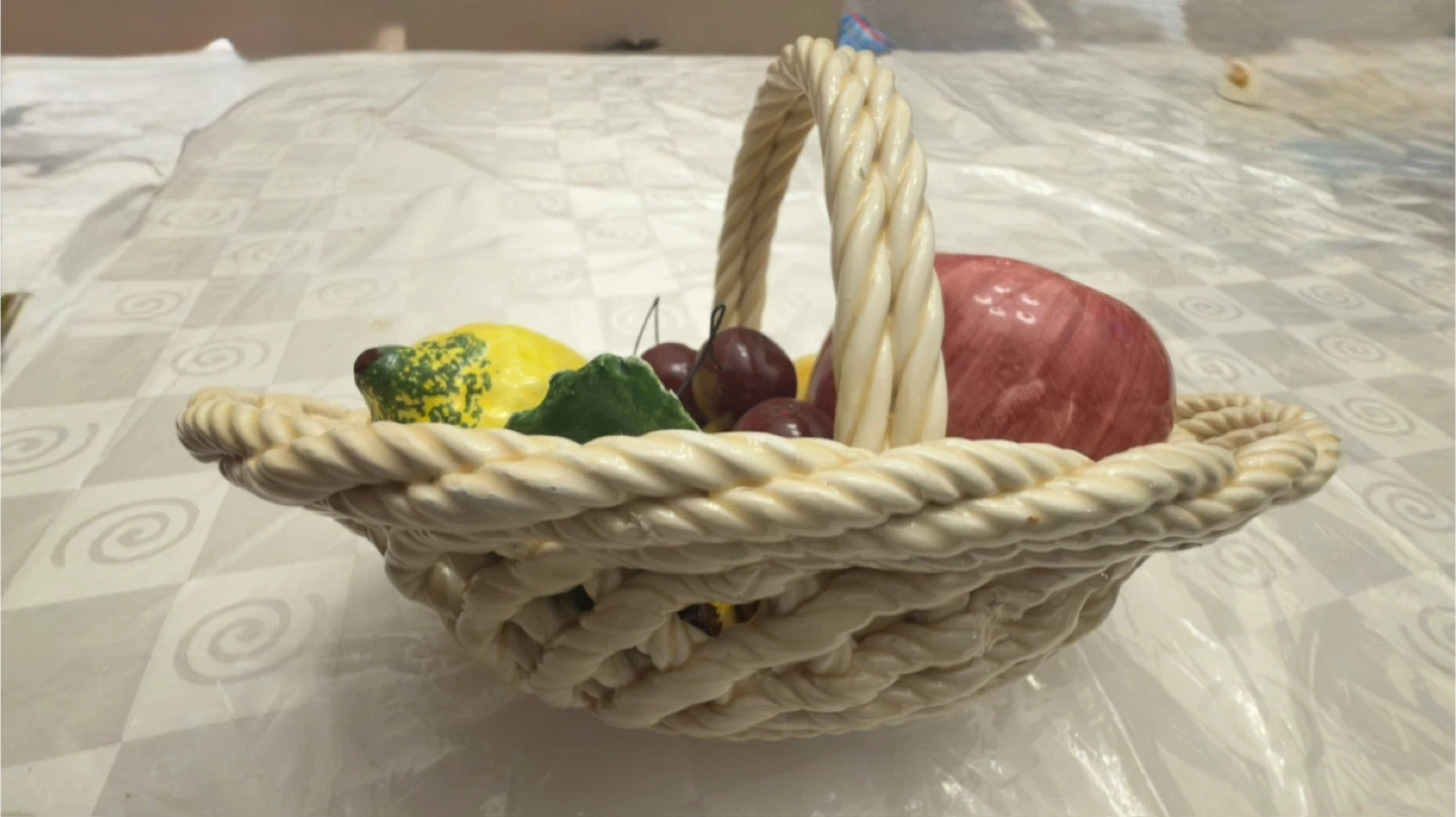 Decorative ceramic basket filled with faux fruits like a banana, apple, lemon, and cherries. It's designed to look like a woven basket. Perfect for adding a touch of kitchen charm! Cash & pickup only