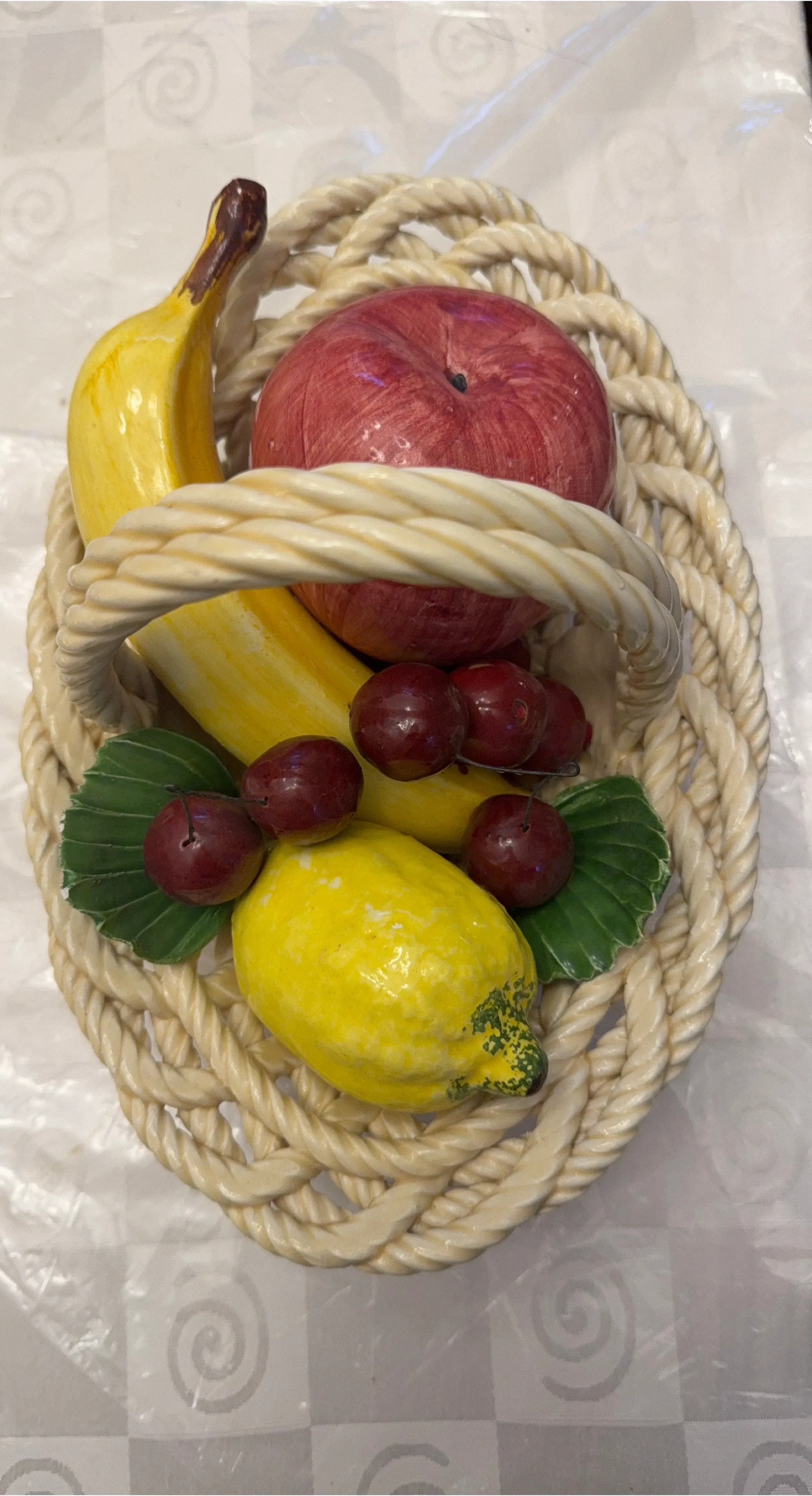 Decorative ceramic basket filled with faux fruits like a banana, apple, lemon, and cherries. It's designed to look like a woven basket. Perfect for adding a touch of kitchen charm! Cash & pickup only