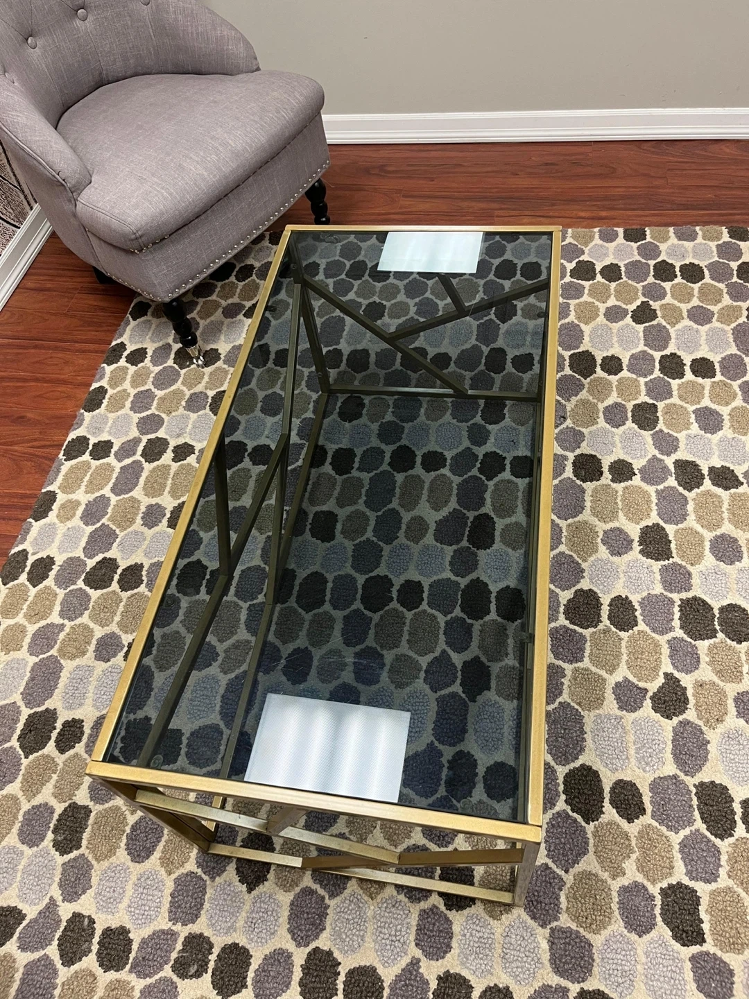 Stylish coffee table with a gold metal geometric base and a smoked glass top. It's a great statement piece for any living room.
