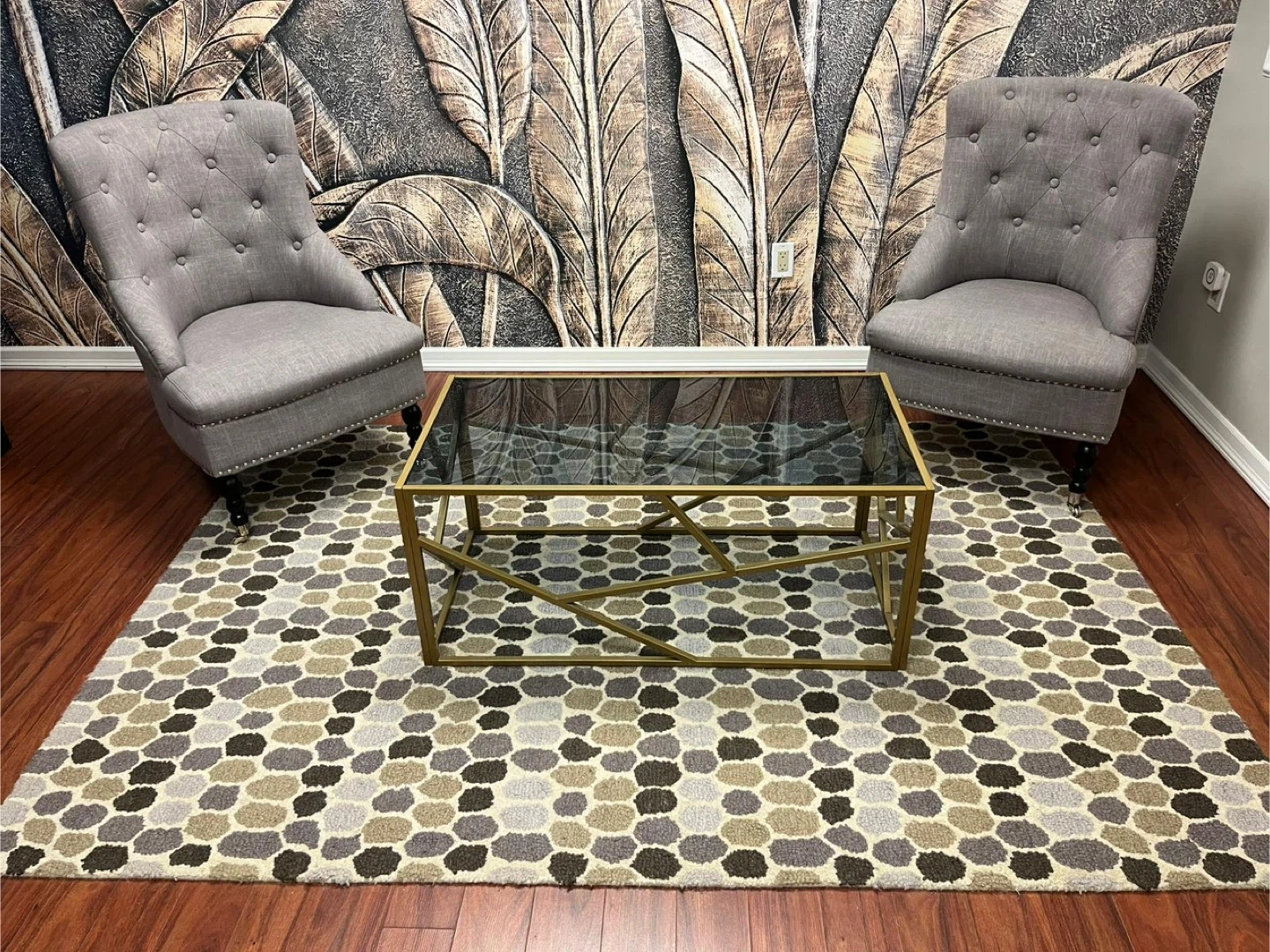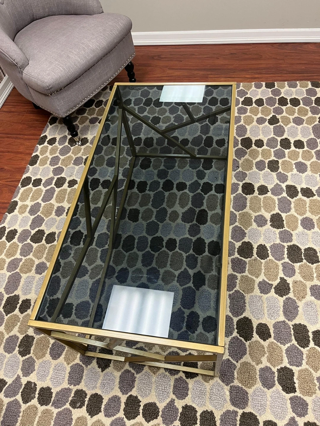 Stylish coffee table with a gold metal geometric base and a smoked glass top. It's a great statement piece for any living room.