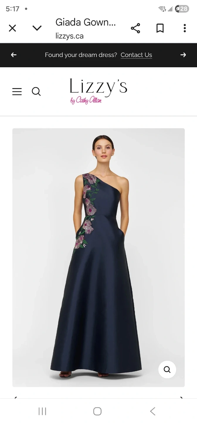 This navy one-shoulder gown features floral embellishments on the bodice and a flattering A-line skirt. It has pockets! The satin-like fabric drapes beautifully for an elegant look. A stunning choice for formal events.