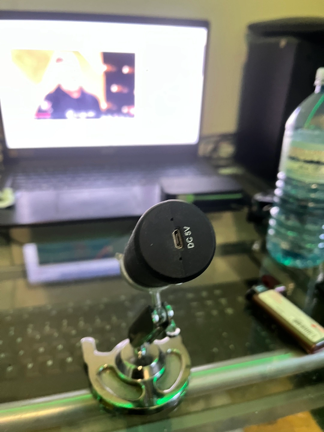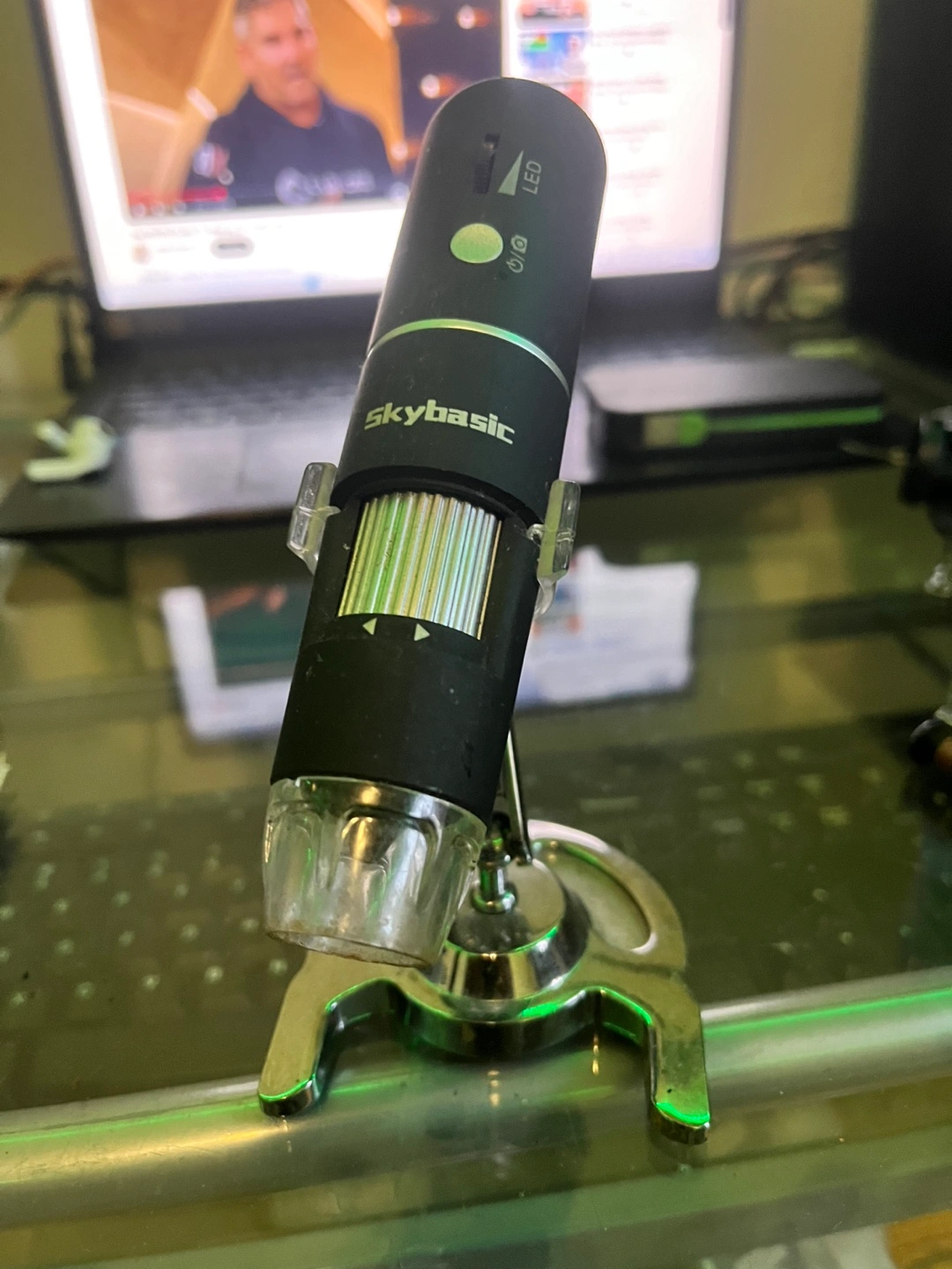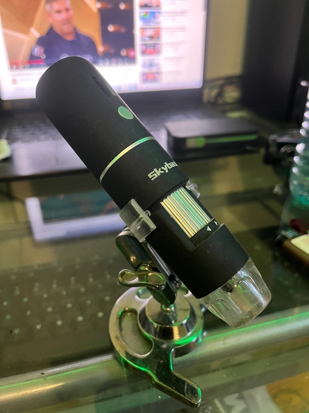 Portable digital microscope. Features a USB connection and LED light. Includes a metal stand for hands-free use. Great for viewing small objects.