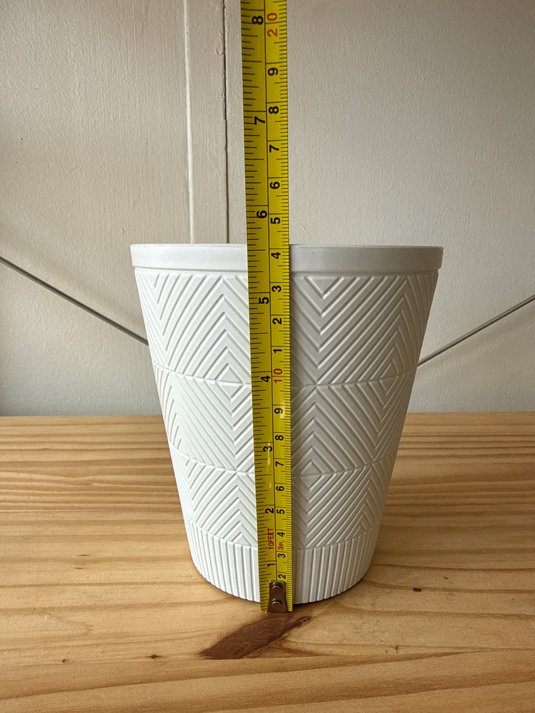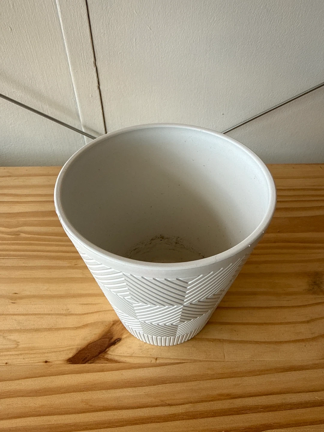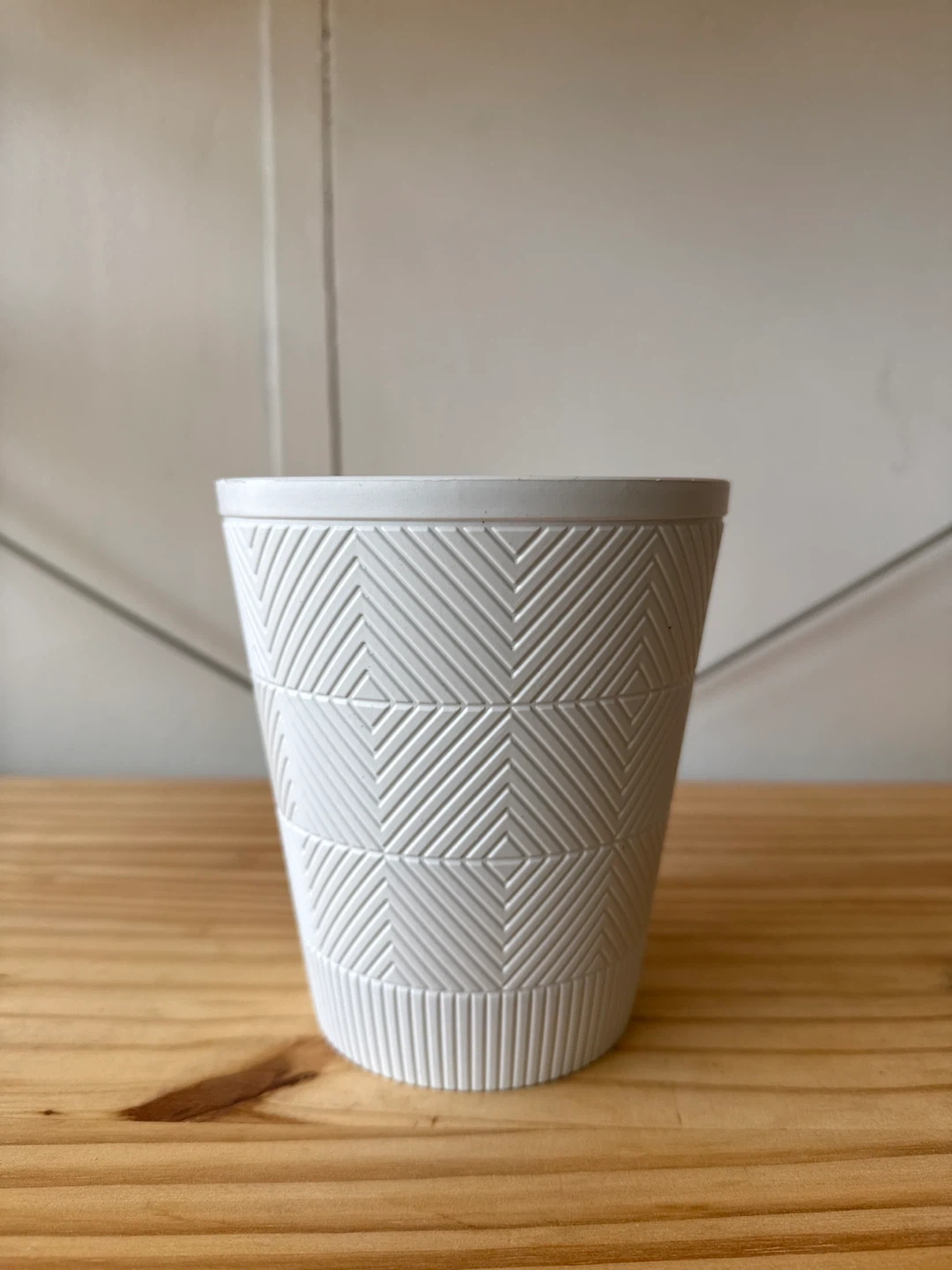 This white planter pot has a geometric embossed pattern around its exterior. It stands about 4 inches tall and has a diameter of approximately 5 inches at the top. It's made of a durable material suitable for indoor or outdoor plants.