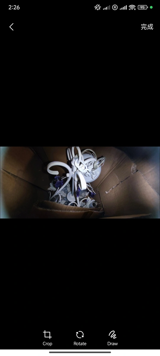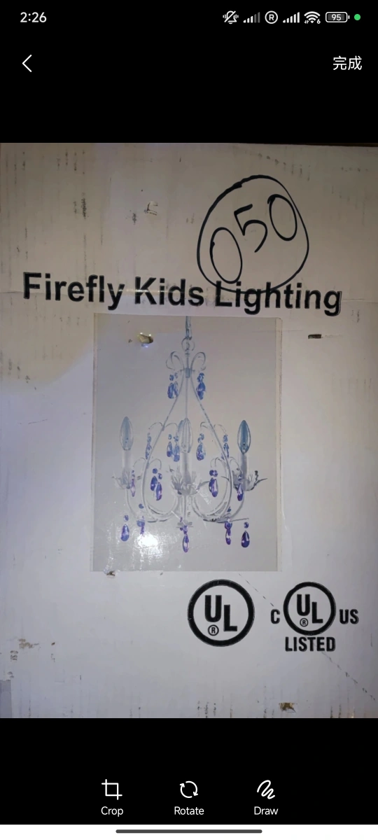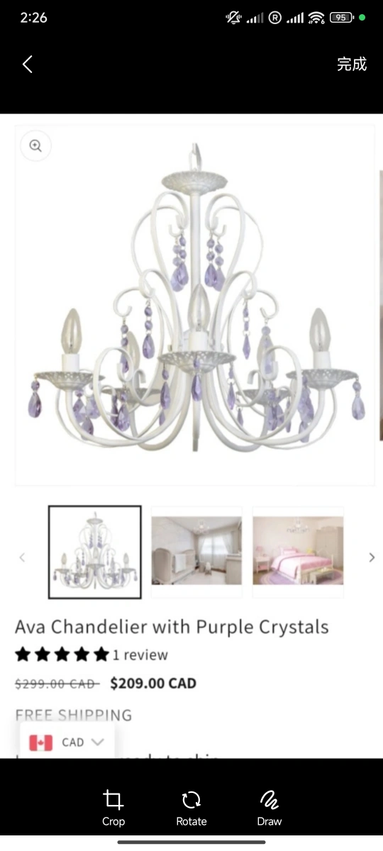 White Chandelier with purple crystal accents. Suitable for a child's bedroom or play area.