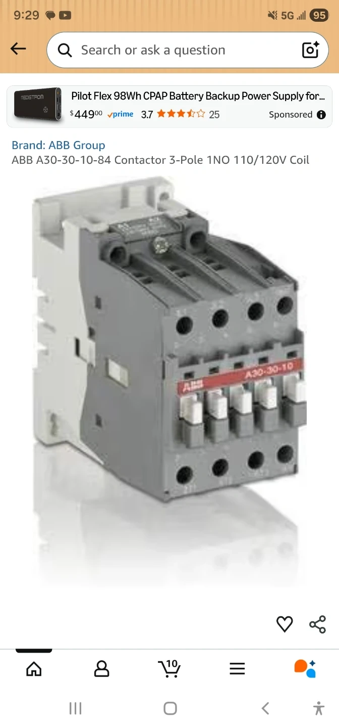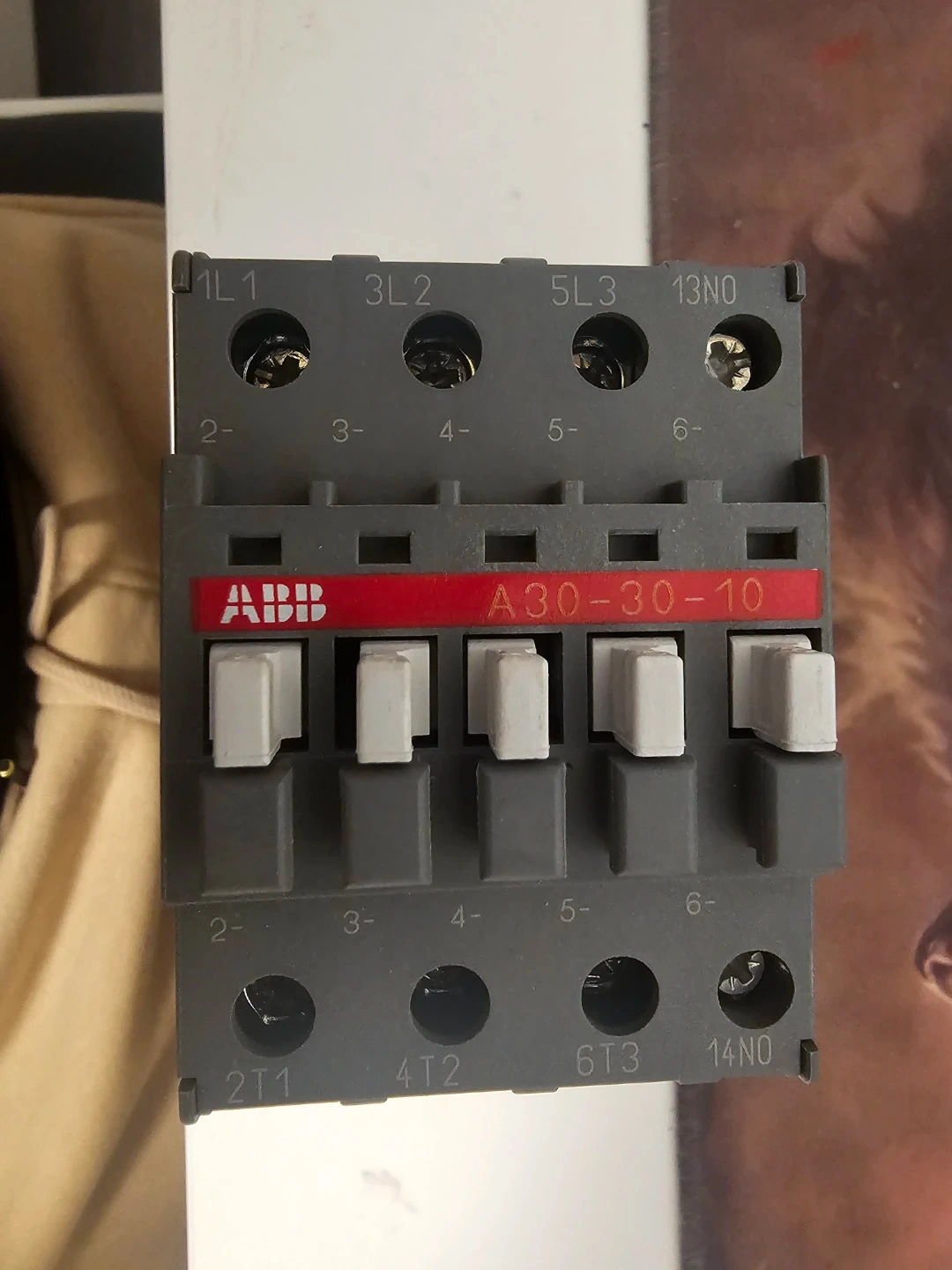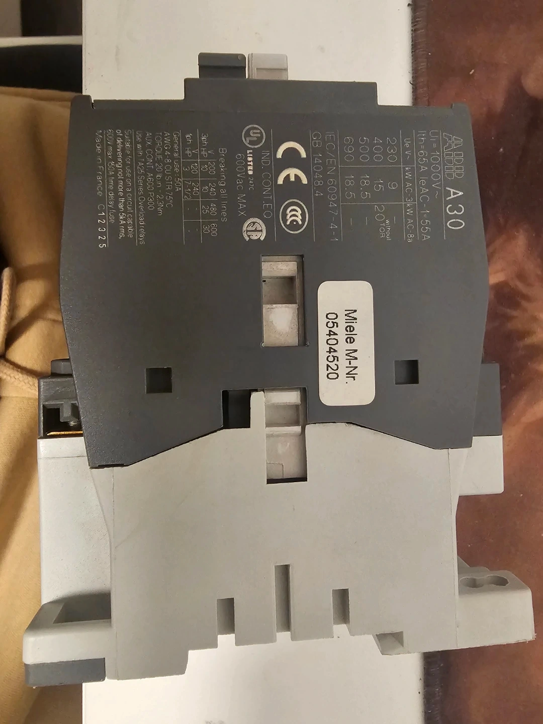 This is an ABB A30-30-10 contactor. It operates on 220-230V 50Hz and 230-240V 60Hz power. It's rated for 65A with a 1000V AC rating. Suitable for industrial control applications.