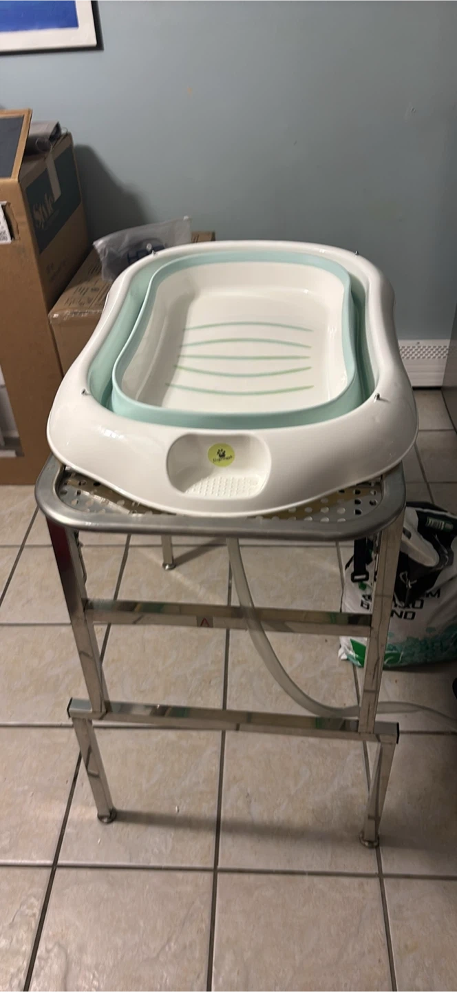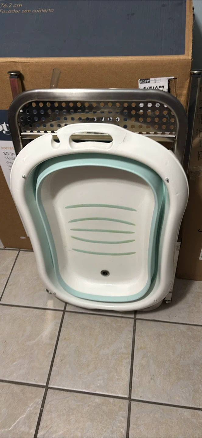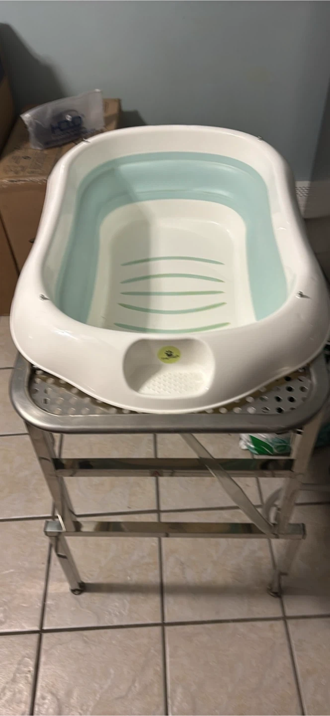 This is a collapsible baby bathtub with a stainless steel stand. It's white and light blue. The tub is made of plastic and includes a drain plug. The stand is foldable for easy storage.