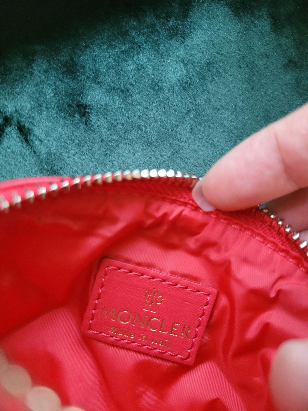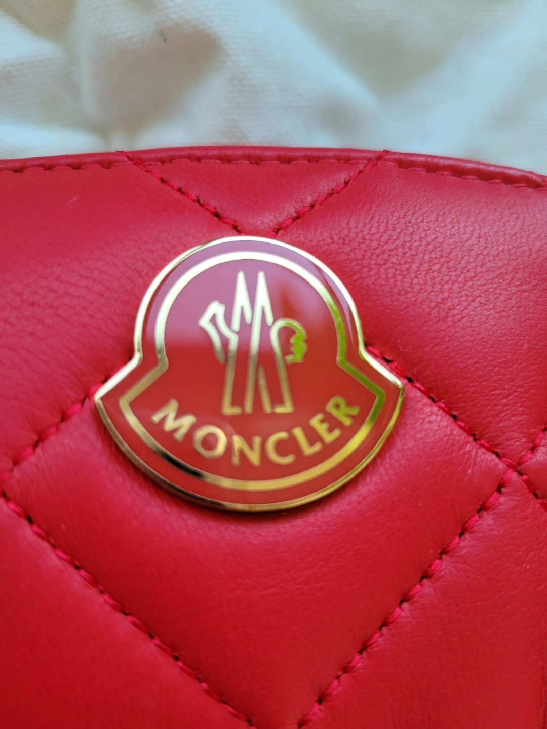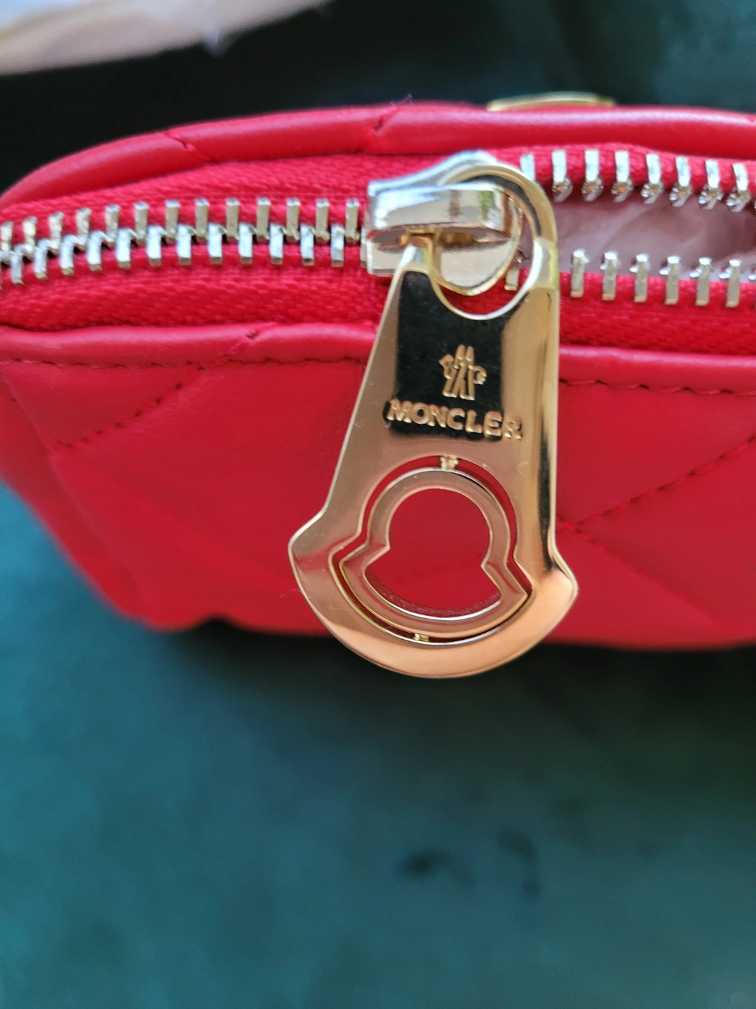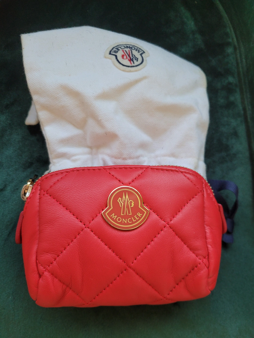 Brand new Moncler Adorable red quilted leather pouch. Features gold Moncler logo. Zipper closure. Small size, perfect for cosmetics or cards.