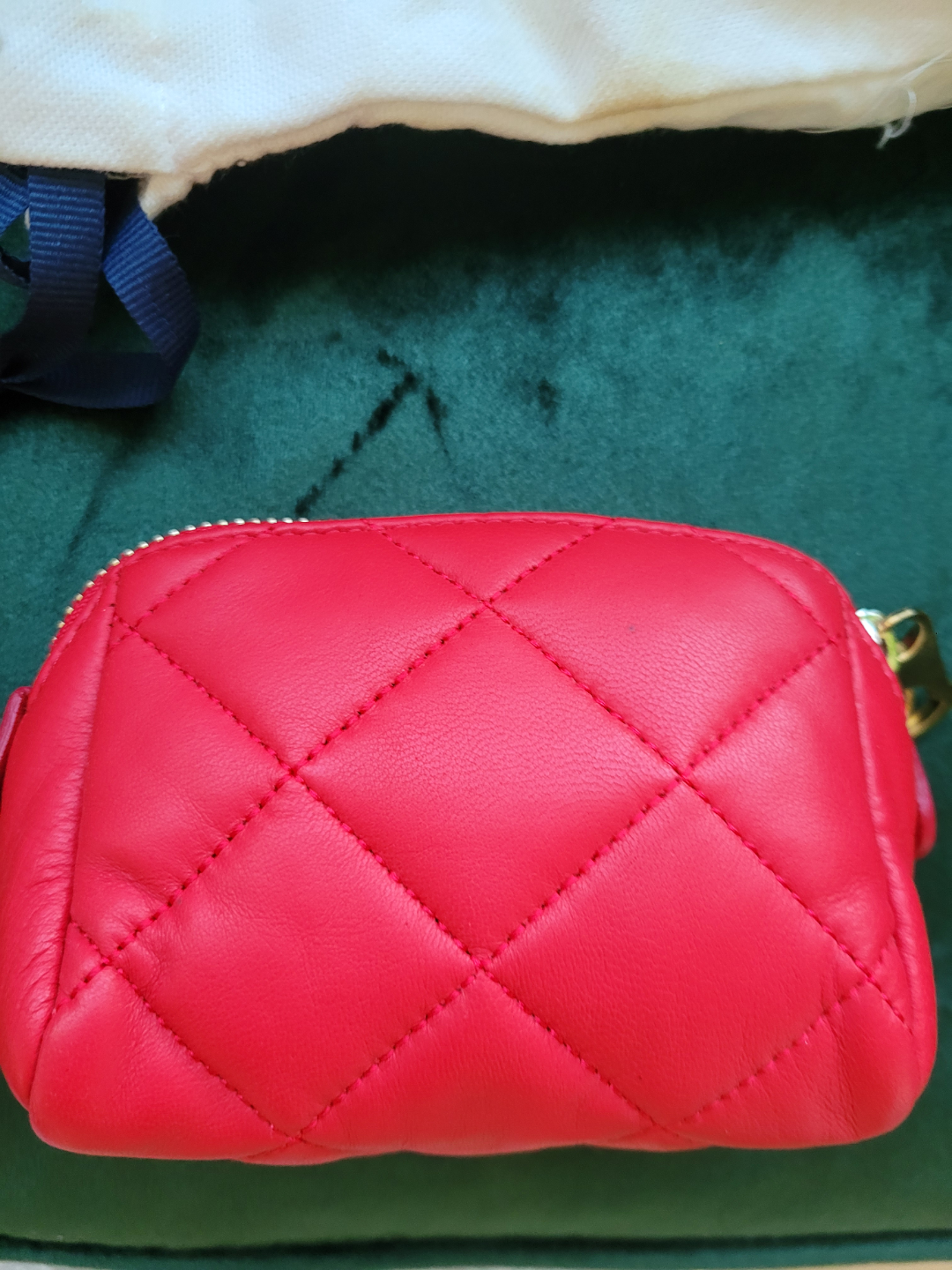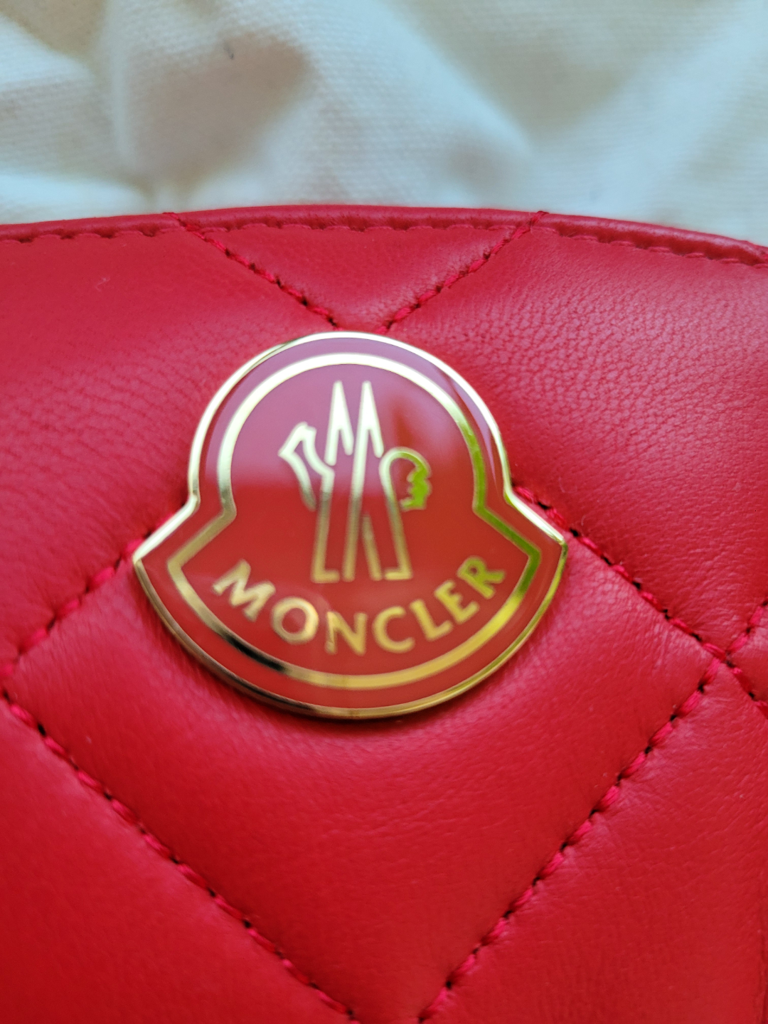 Brand new Moncler Adorable red quilted leather pouch. Features gold Moncler logo. Zipper closure. Small size, perfect for cosmetics or cards.