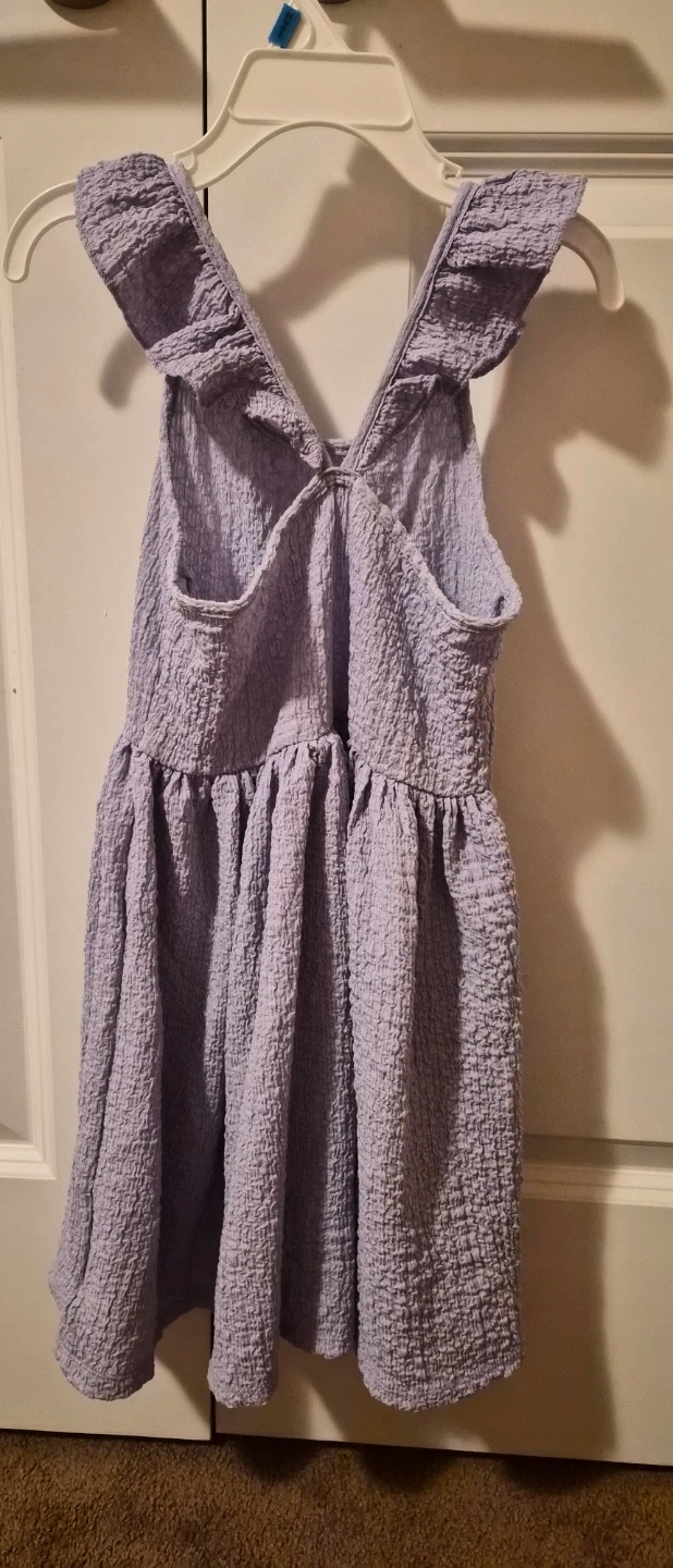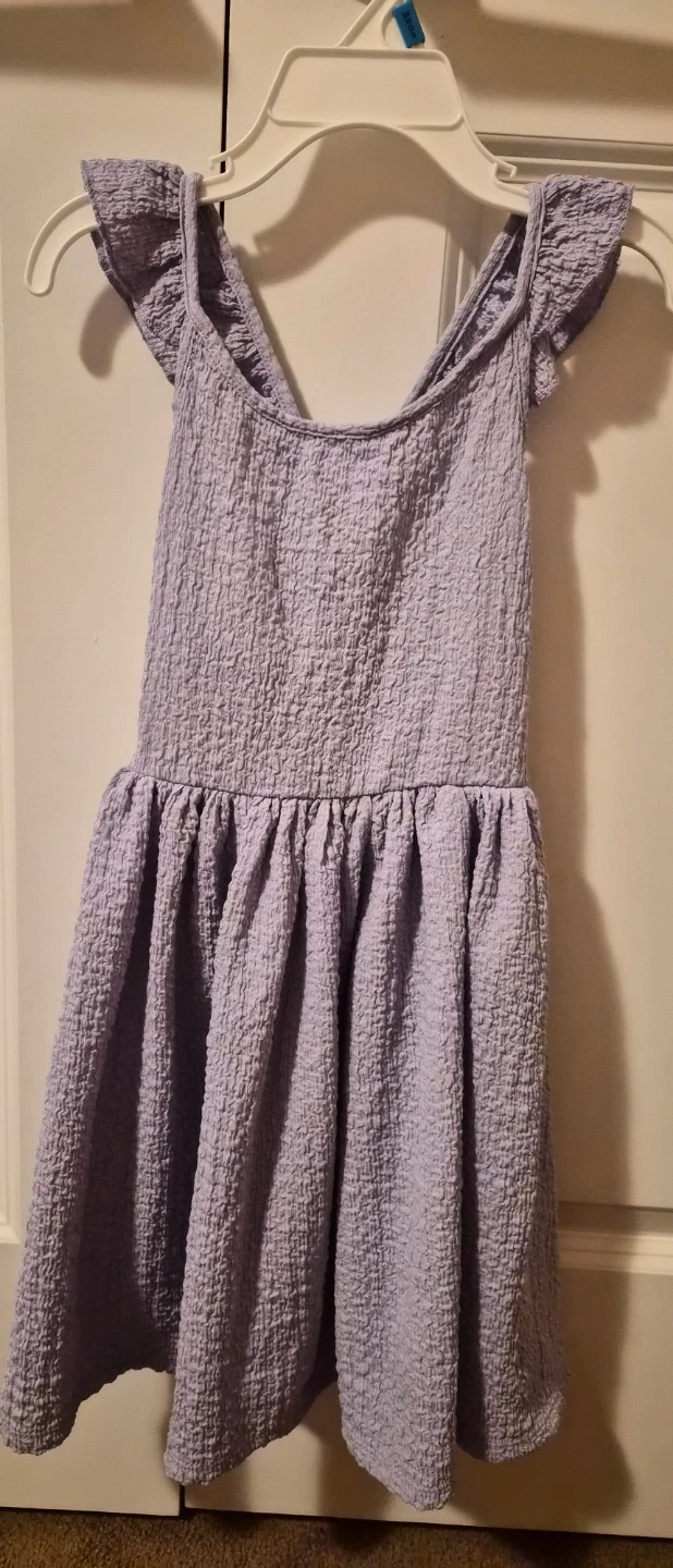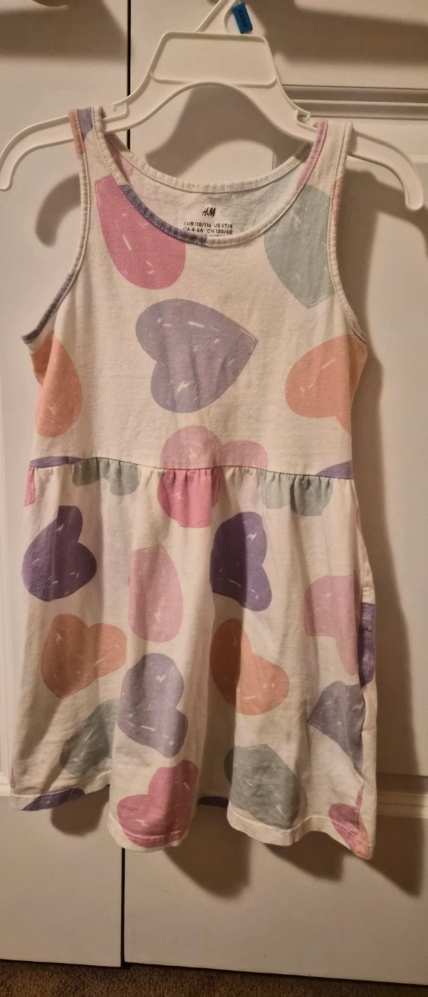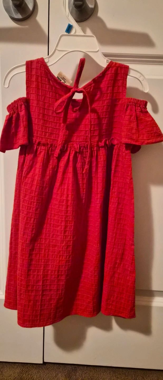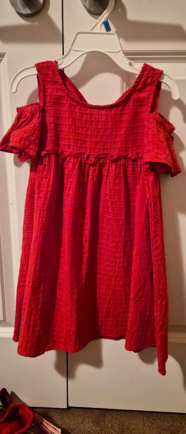 Four cute dresses for girls. Includes two cold-shoulder ruffled dresses, one red and one purple, and a heart-print tank dress. All are size 4-6 years (120/60).
