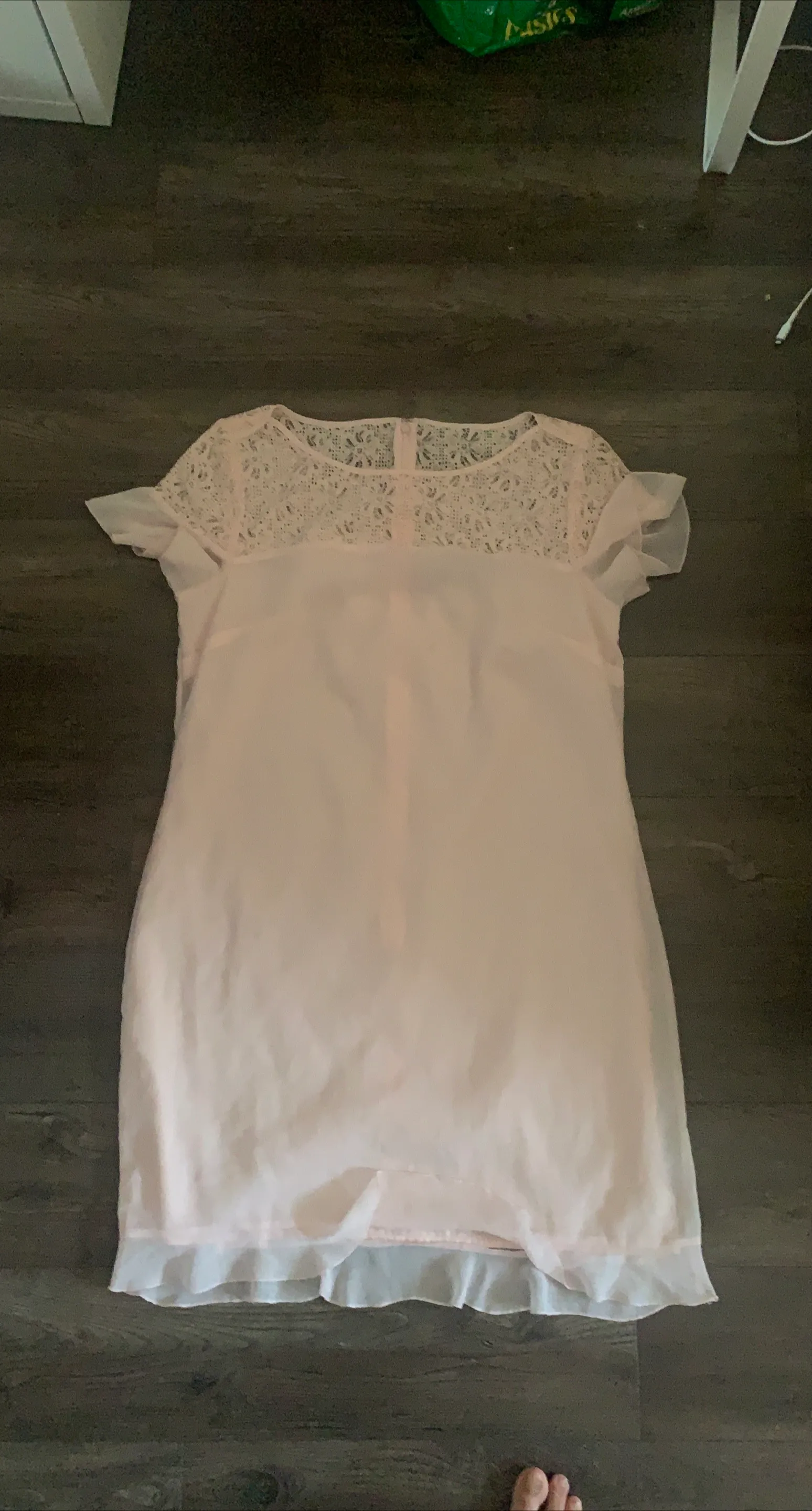 Light pink dress featuring a delicate lace yoke and cap sleeves with ruffled detailing. The main body is a smooth fabric with a sheer ruffled hem. It's perfect for dressing up for an event. Zipper closure at the back.