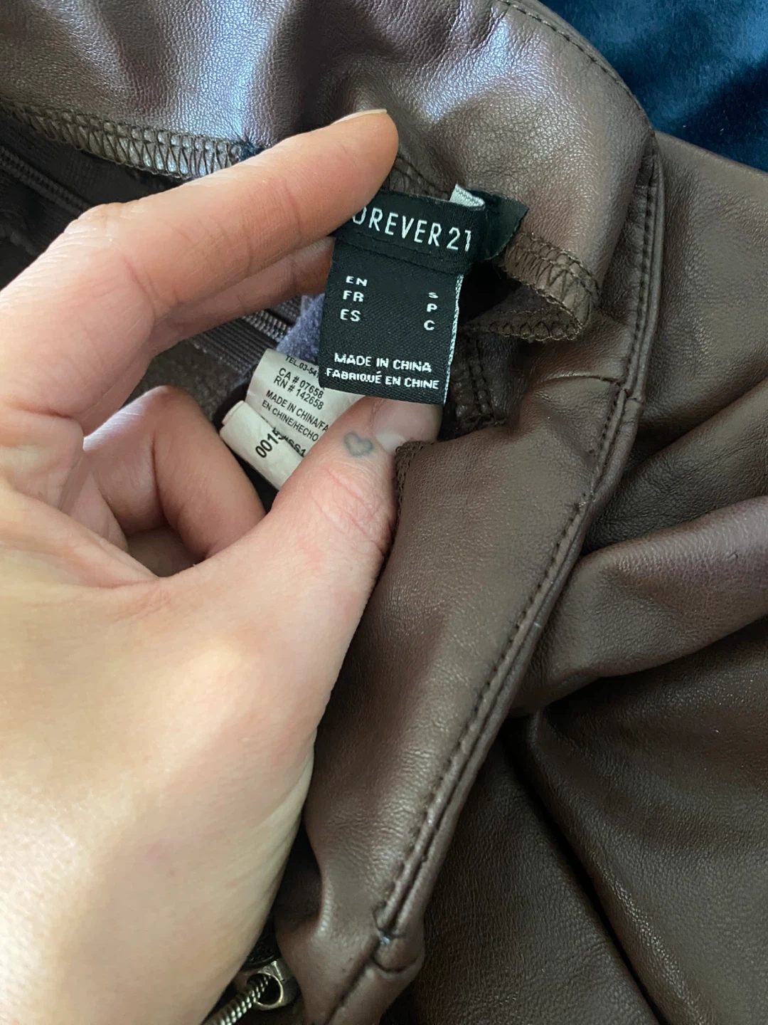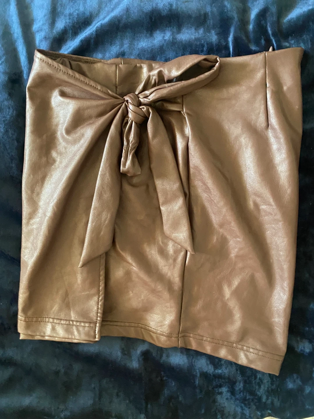 A stylish faux leather mini skirt from Forever 21. It features a wrap design with a tie closure at the front. This chocolate brown skirt is made with a polyester and spandex blend for a comfortable fit.