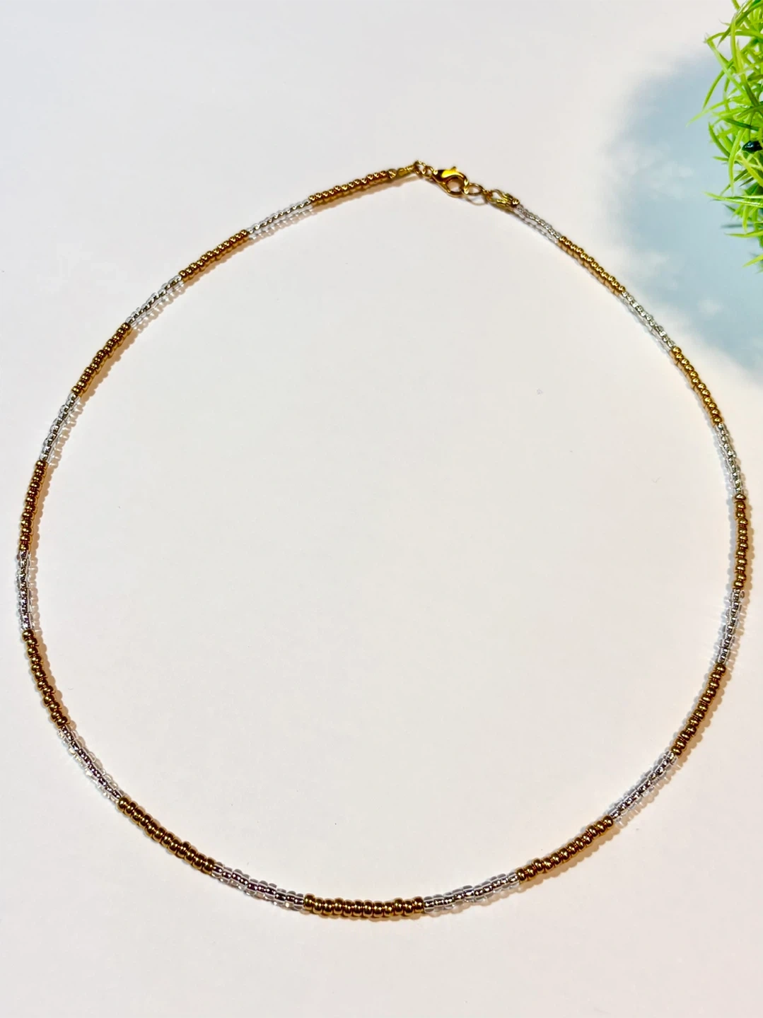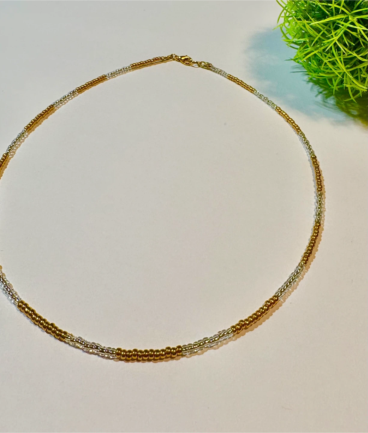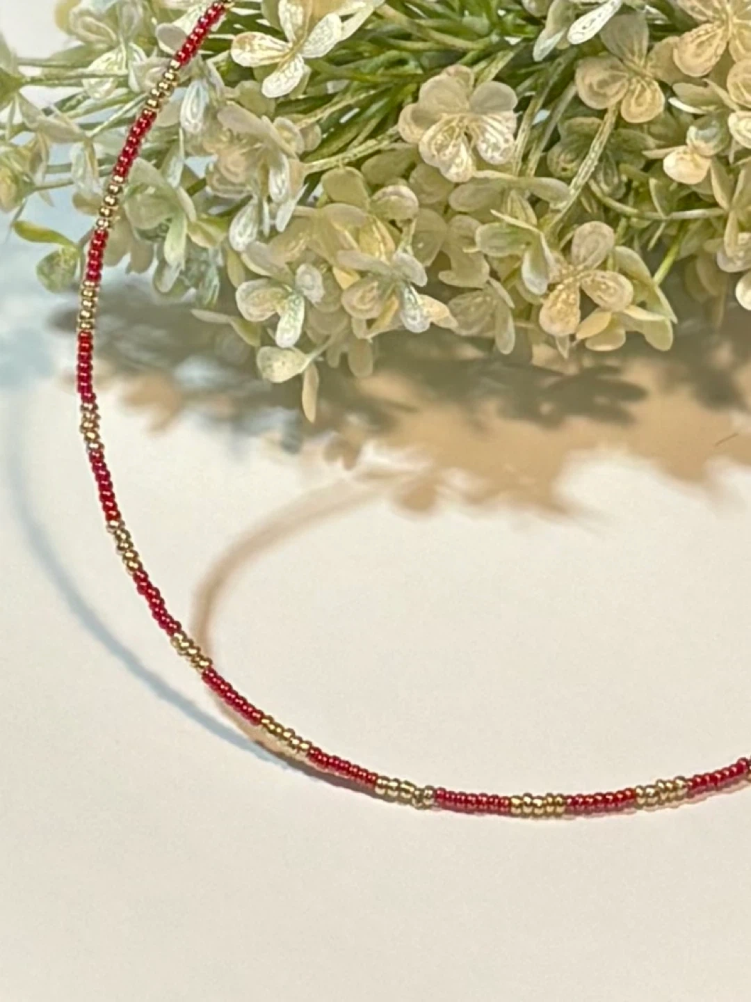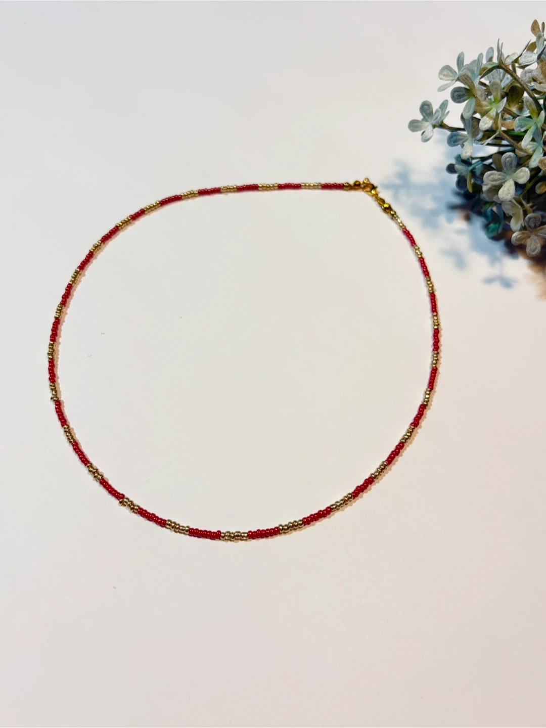 Handmade choker style beaded necklace featuring red and gold beads or gold and white beads. It's perfect for adding a touch of elegant/minimalist to any outfit!