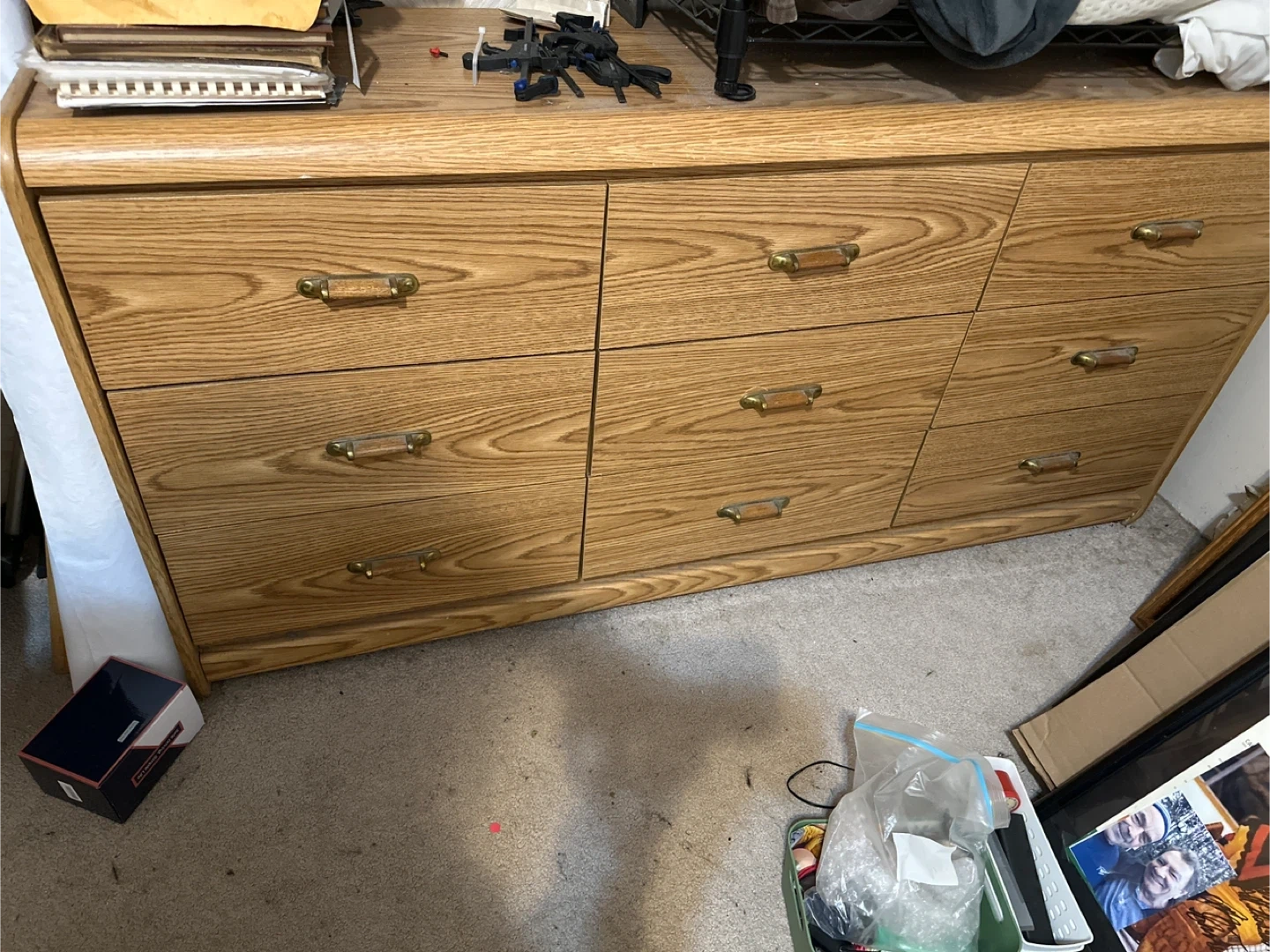 This is a solid wood dresser with a light oak finish. It features nine drawers with simple wooden handles. Plenty of storage for clothes or linens!