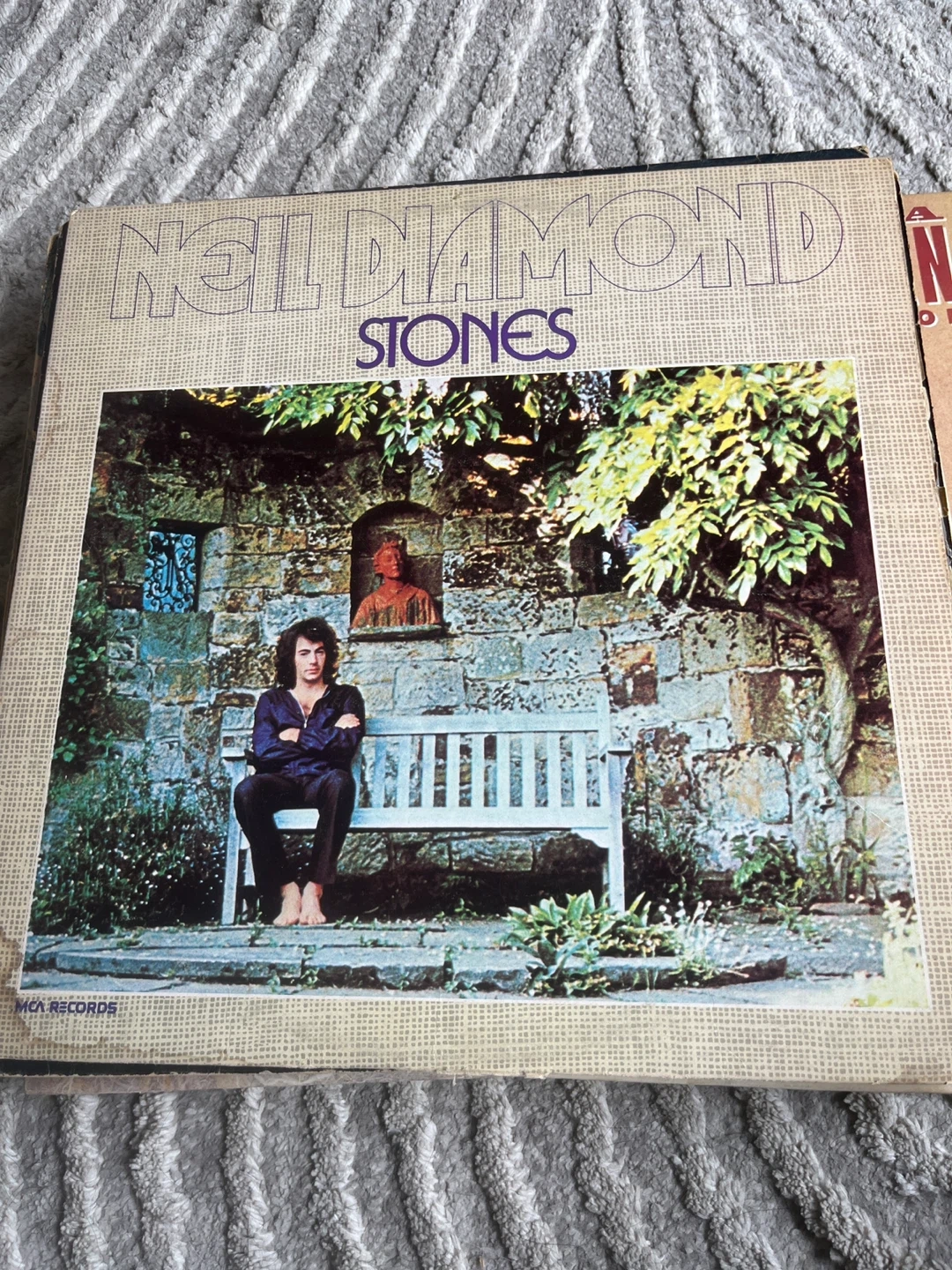 This is the Neil Diamond Stones vinyl record. It features the artist and album title prominently on the cover. The record is part of the MCA Records label.