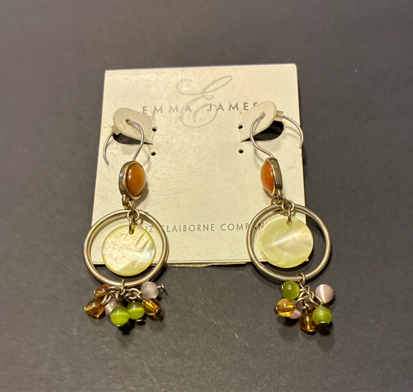 These Emma James earrings feature a drop design with a gold-tone hoop and colourful bead accents. They're a fun addition to any outfit. The earrings include round mother-of-pearl discs and amber-coloured stones.