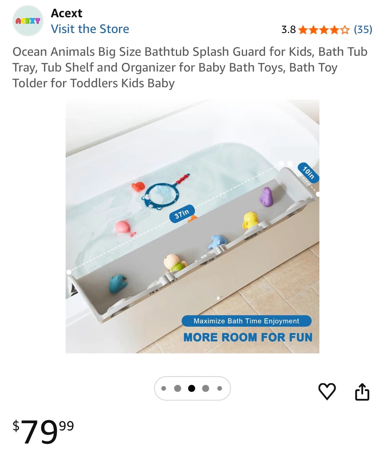This bathtub splash guard and organizer tray is designed for kids' bath time. It's a big size, measuring 37 inches long and 10 inches wide, perfect for keeping toys tidy and prevents water from splashing outside tub. It also acts as a tray and organizer for bath toys.