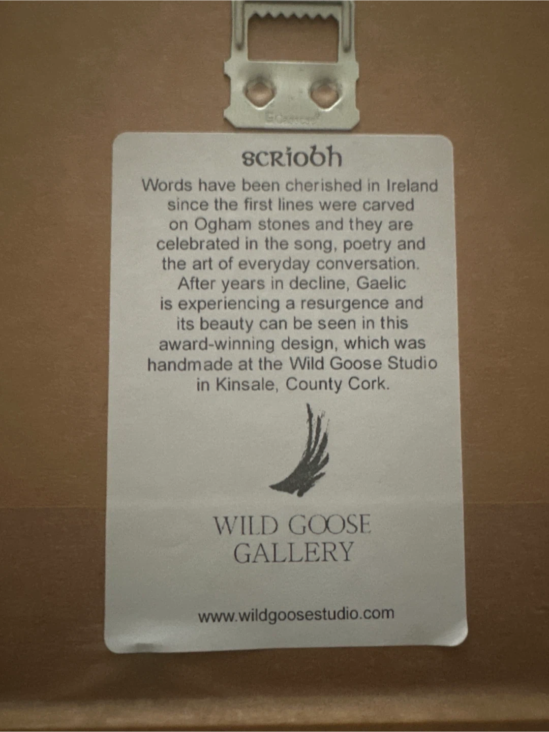This is a framed metal sign with "Sláinte" (Irish) engraved in black. It has a sleek, dark metallic finish. Signed "Health" on the matting. Framed in dry light oak wood.