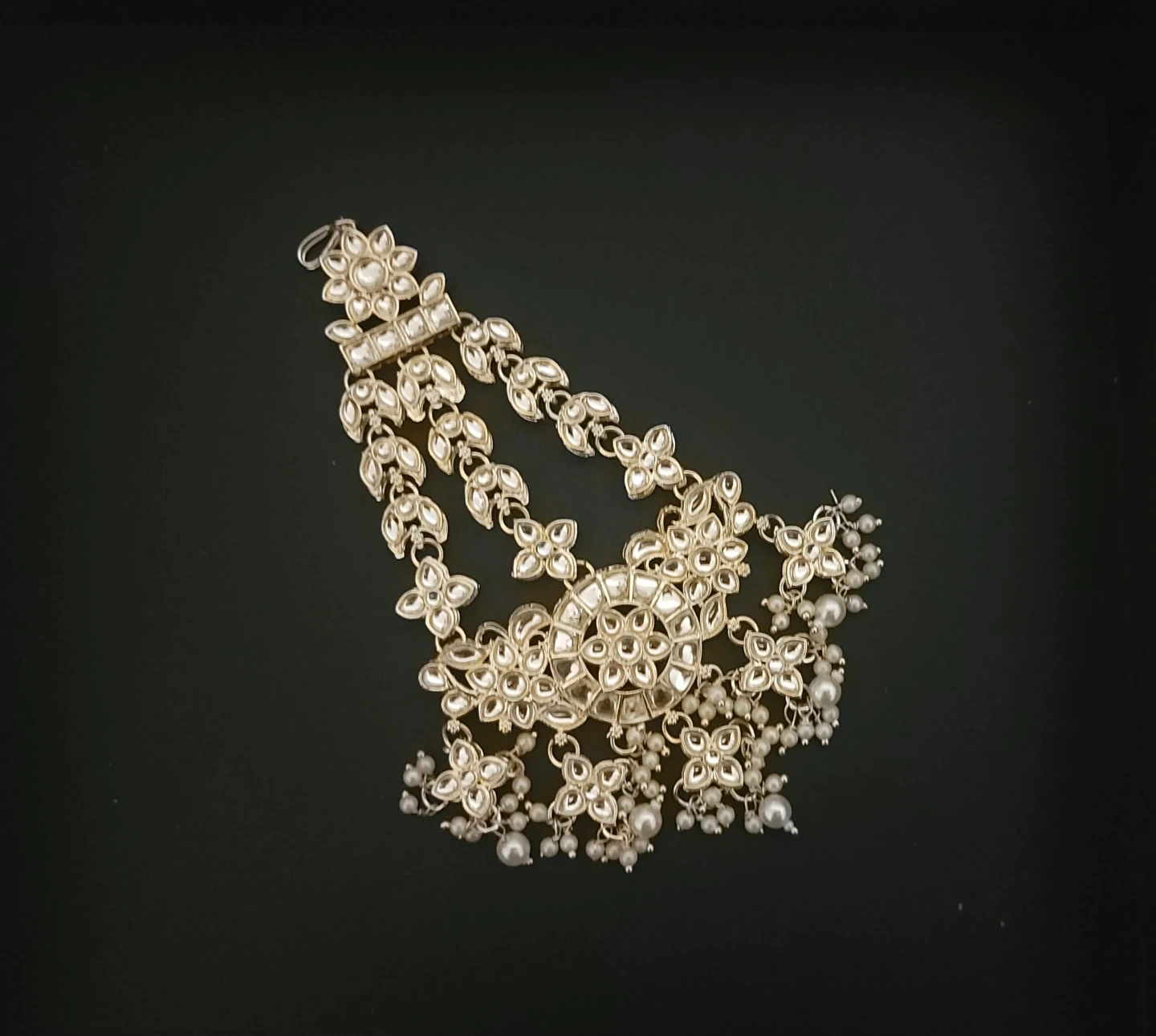 A beautiful gold-toned hair accessory adorned with kundan stones and pearl tassels. It features an intricate floral design. This piece is perfect for adding a touch of elegance to traditional outfits. The material appears to be metal with faux pearls.