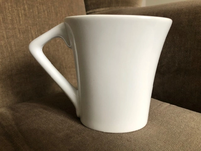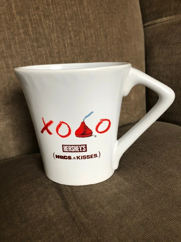 Never used. Vintage 1990’s Hershey’s chocolate mug cup. "Hugs and Kisses". Unique oval shape with triangled handle. 4.5” tall, 4.25” oval top, oval base 3 1/8”. Holds 13 oz. Dishwasher and microwave safe. Pickup in Brampton, near Queen and Kennedy.
