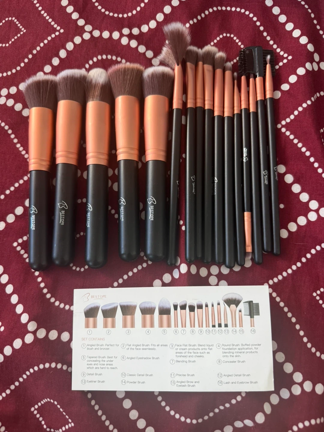 This is a 16-piece makeup brush set from BESTOPE. It includes a variety of brushes for face and eye application. The set comes with an angled brush, flat angled brush, face flat brush, round brush, tapered brush, angled eyeshadow brush, blending brush, concealer brush, detail brush, classic detail brush, precise brush, angled detail brush, eyeliner brush, powder brush, angled brow and eyelash brush, and a lash and eyebrow brush.