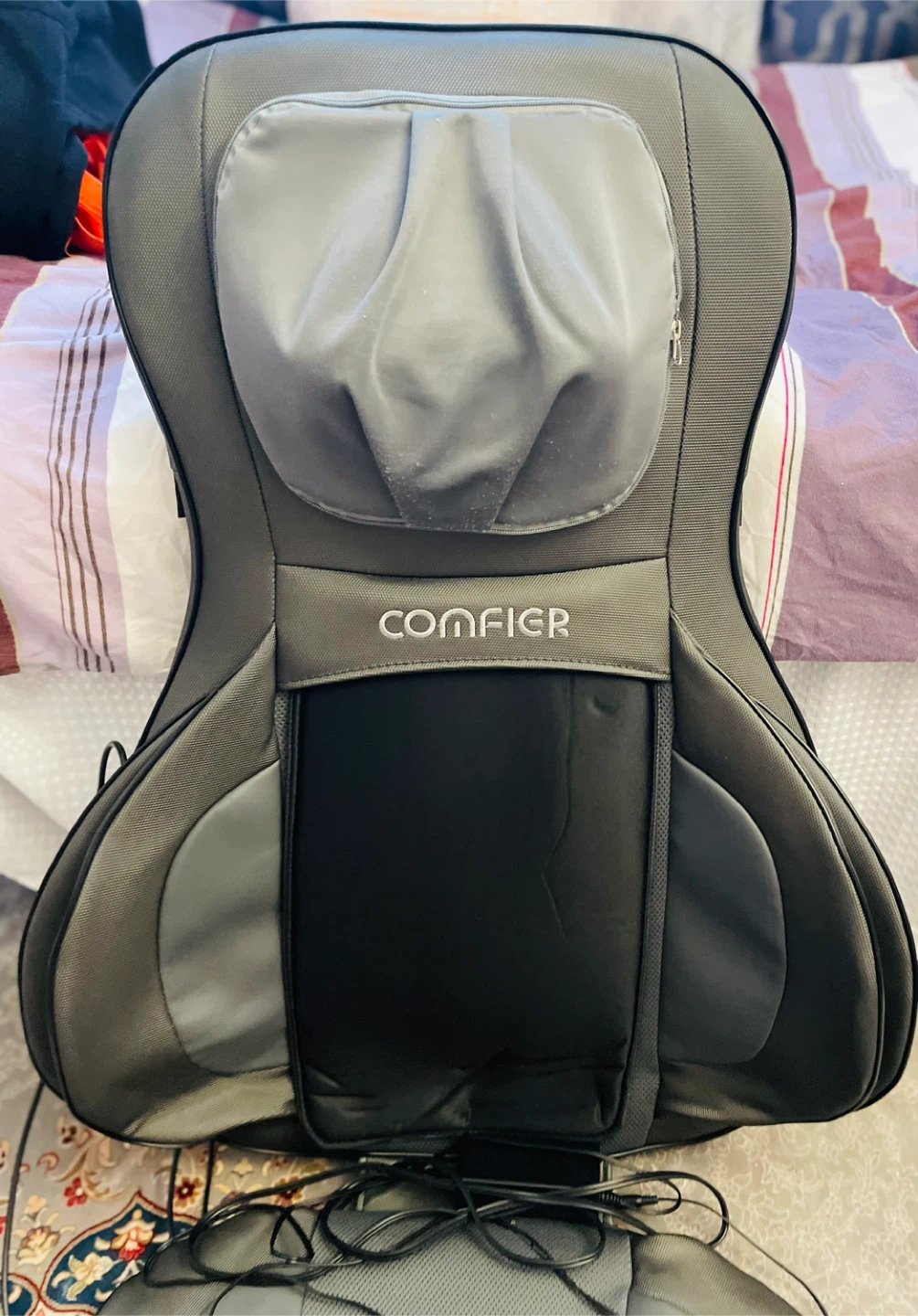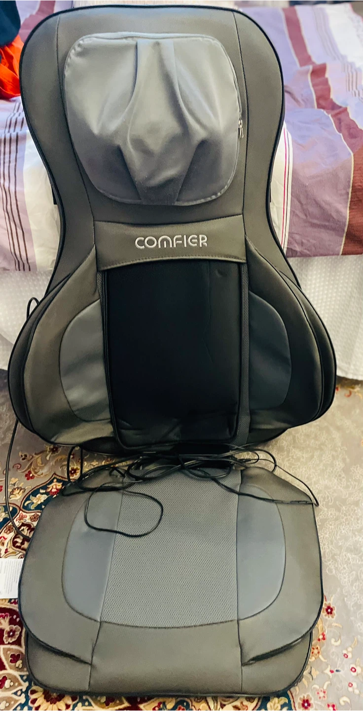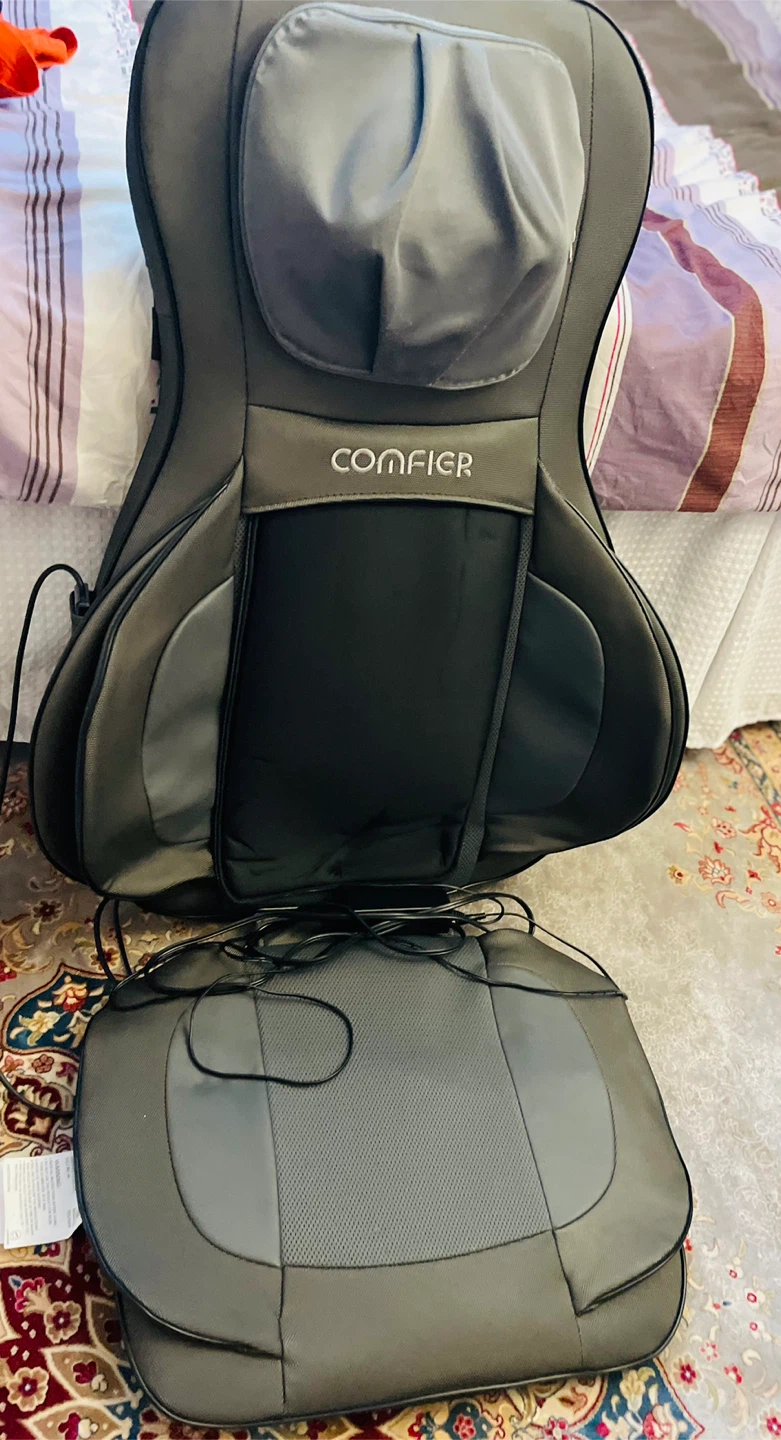 This is a Comfier brand massage seat pad. It's grey and black with a power adapter included. It offers a shiatsu massage experience.