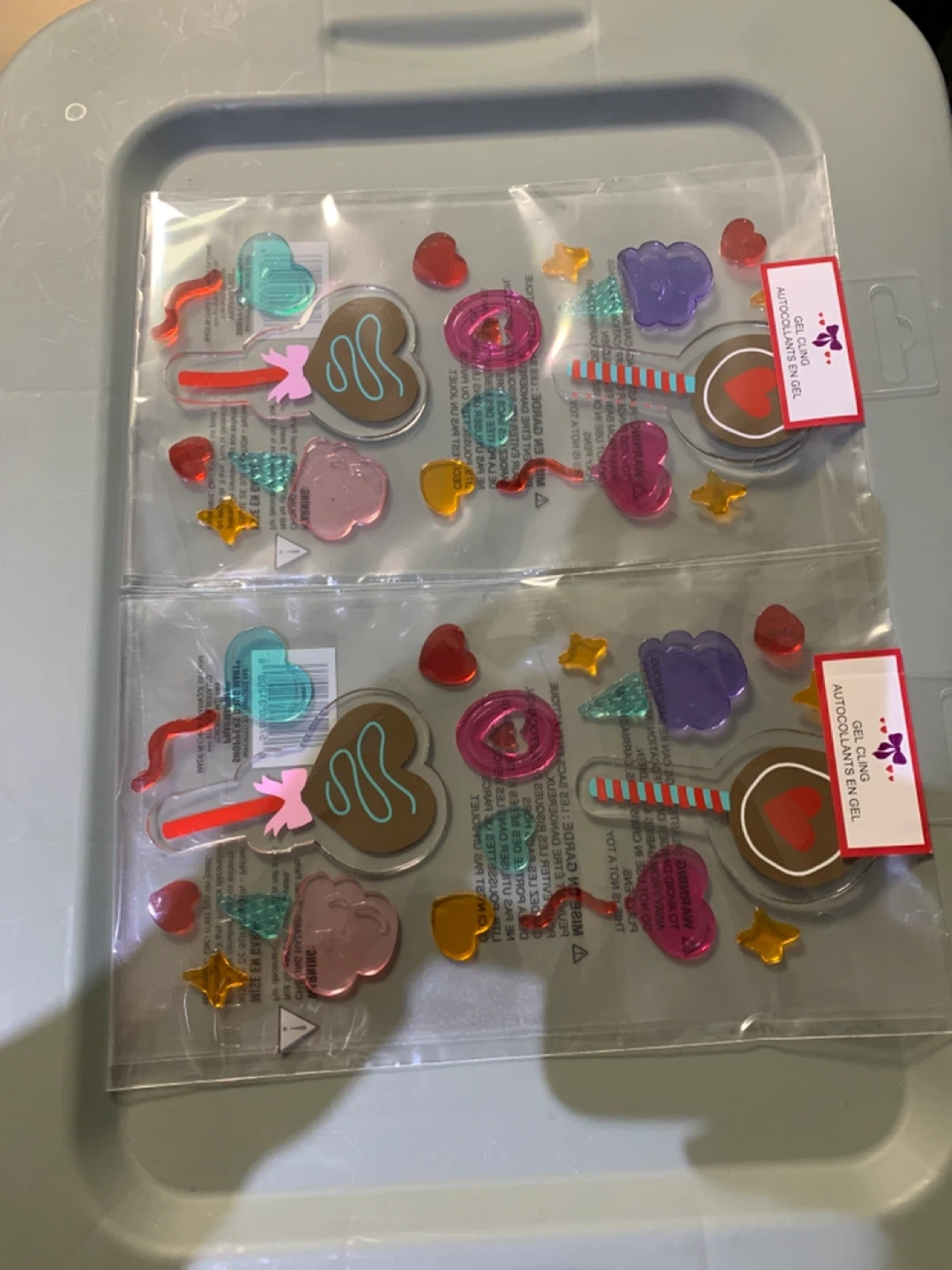Two packs of gel cling stickers featuring sweet treats like lollipops and hearts. These are reusable and safe for windows. They're great for decorating any smooth surface!