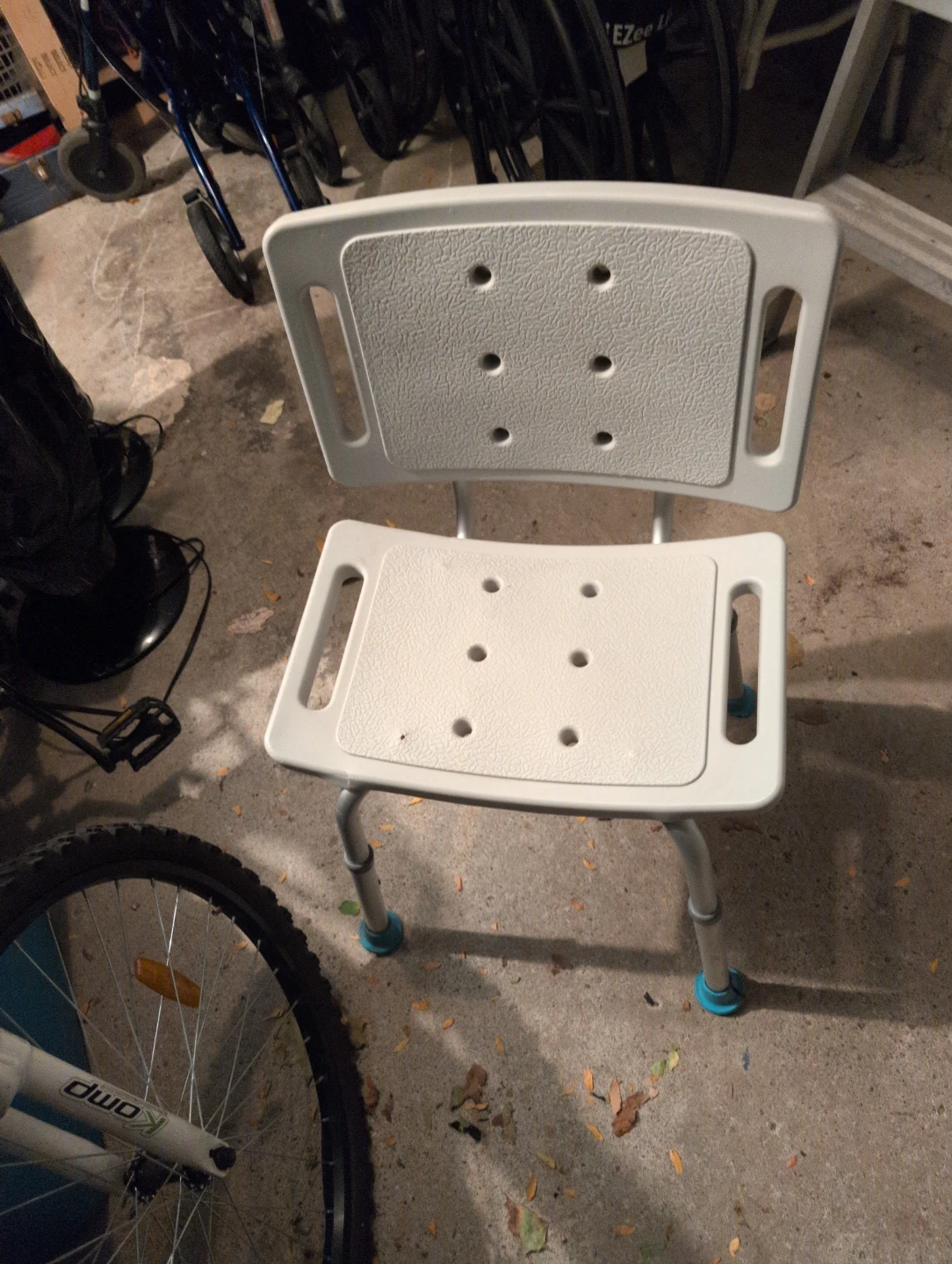 This is a shower chair with a backrest. It's made of durable plastic and aluminum. The legs have adjustable height and blue non-slip feet. Designed for safety and comfort in the shower or bathtub.