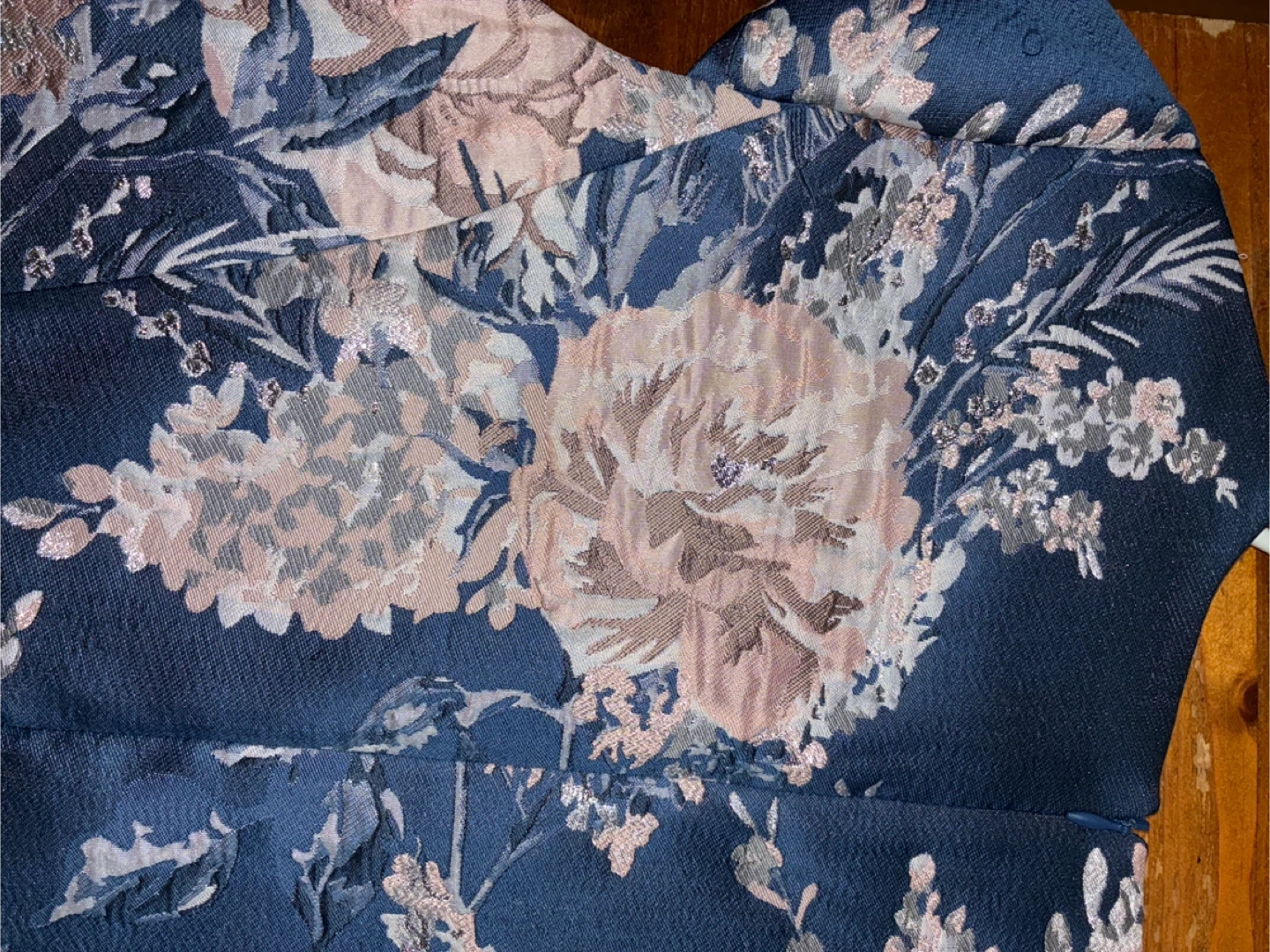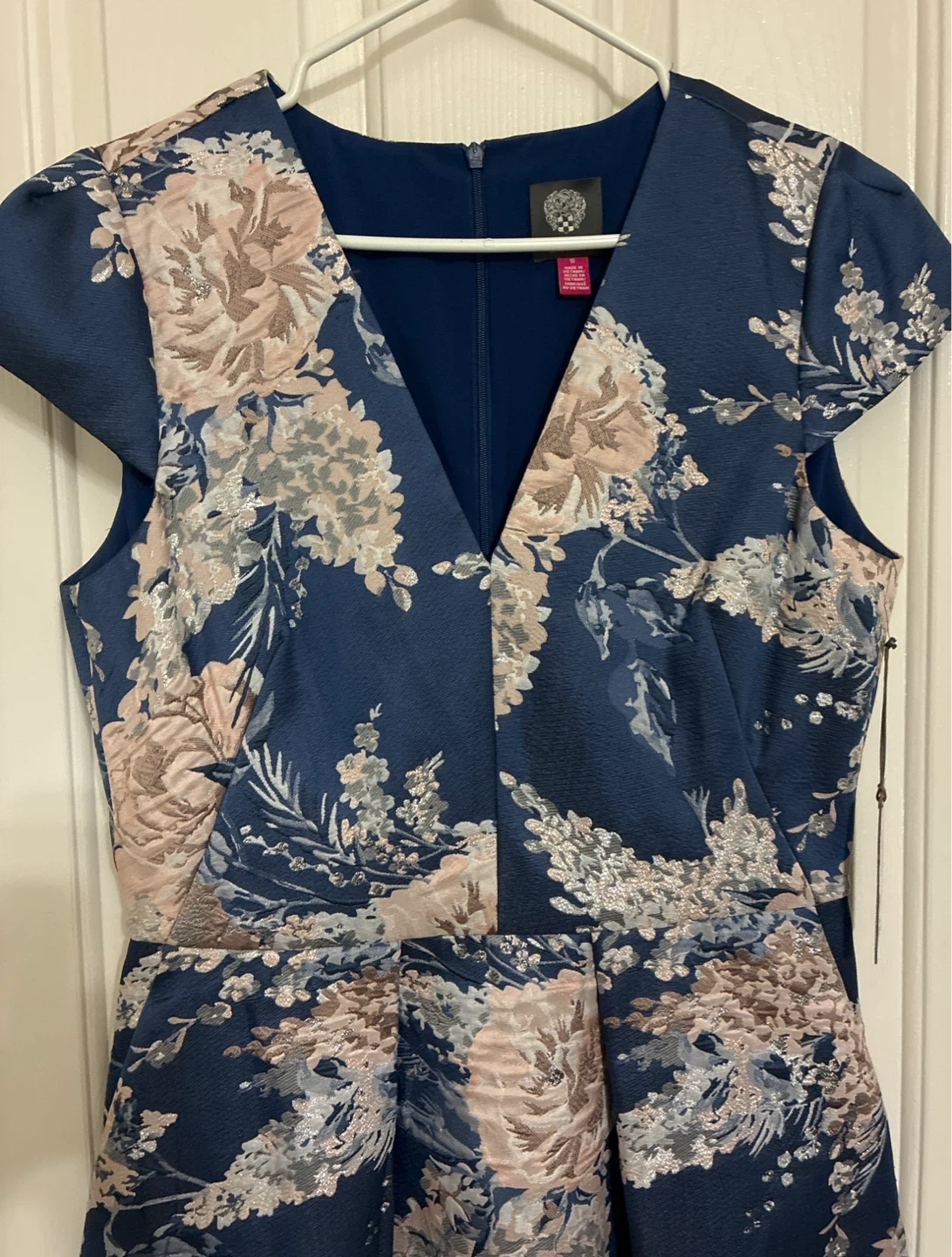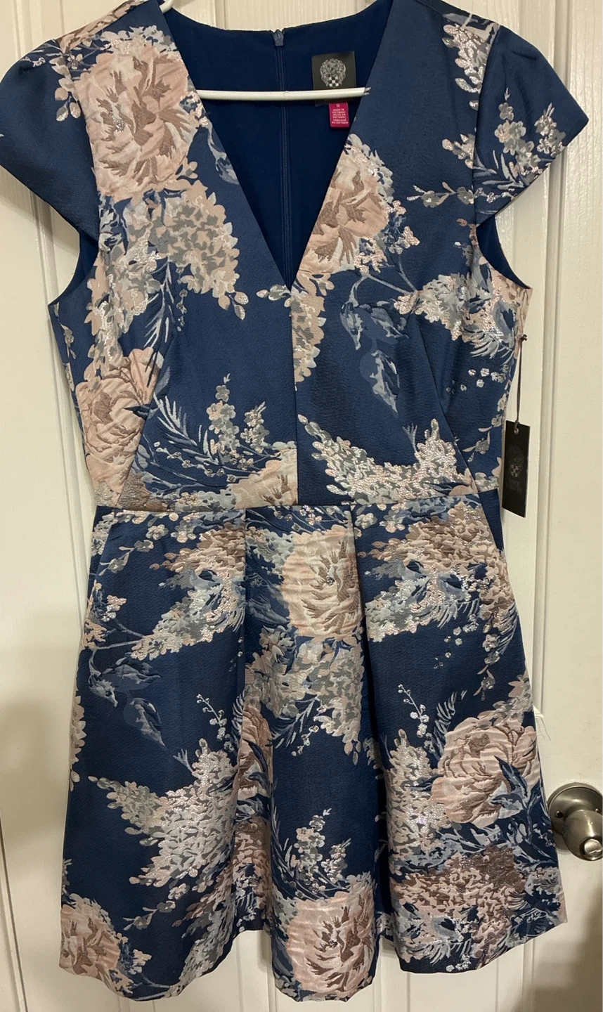 This Vince Camuto dress features a beautiful blue floral metallic jacquard fit and flare pattern. It's a size 10 with short sleeves and a V-neckline. It's perfect for a special occasion!