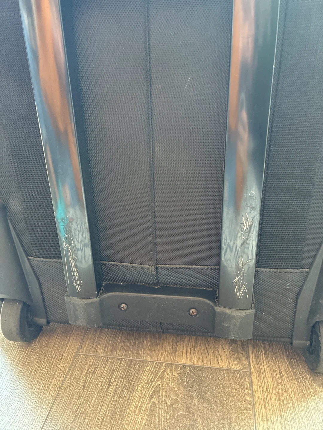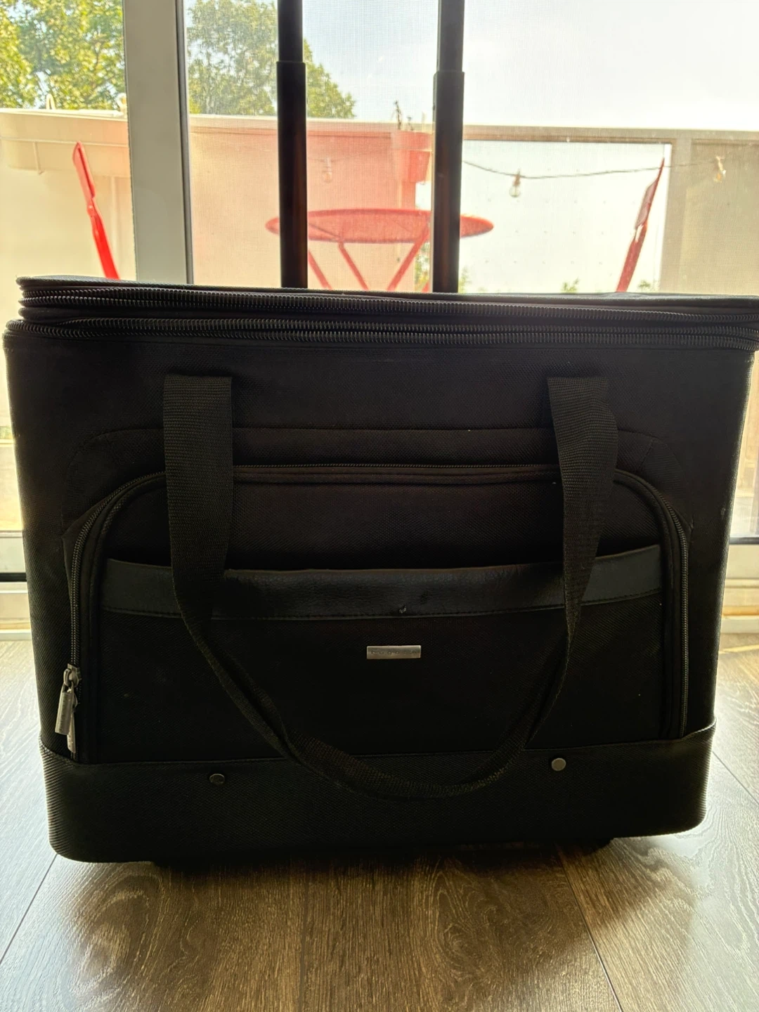 Selling a Bugatti laptop bag in black. It's in great shape, just has some scratches on the metal part on the back. This rolling bag is perfect for travel or commuting. It retails for around $300.