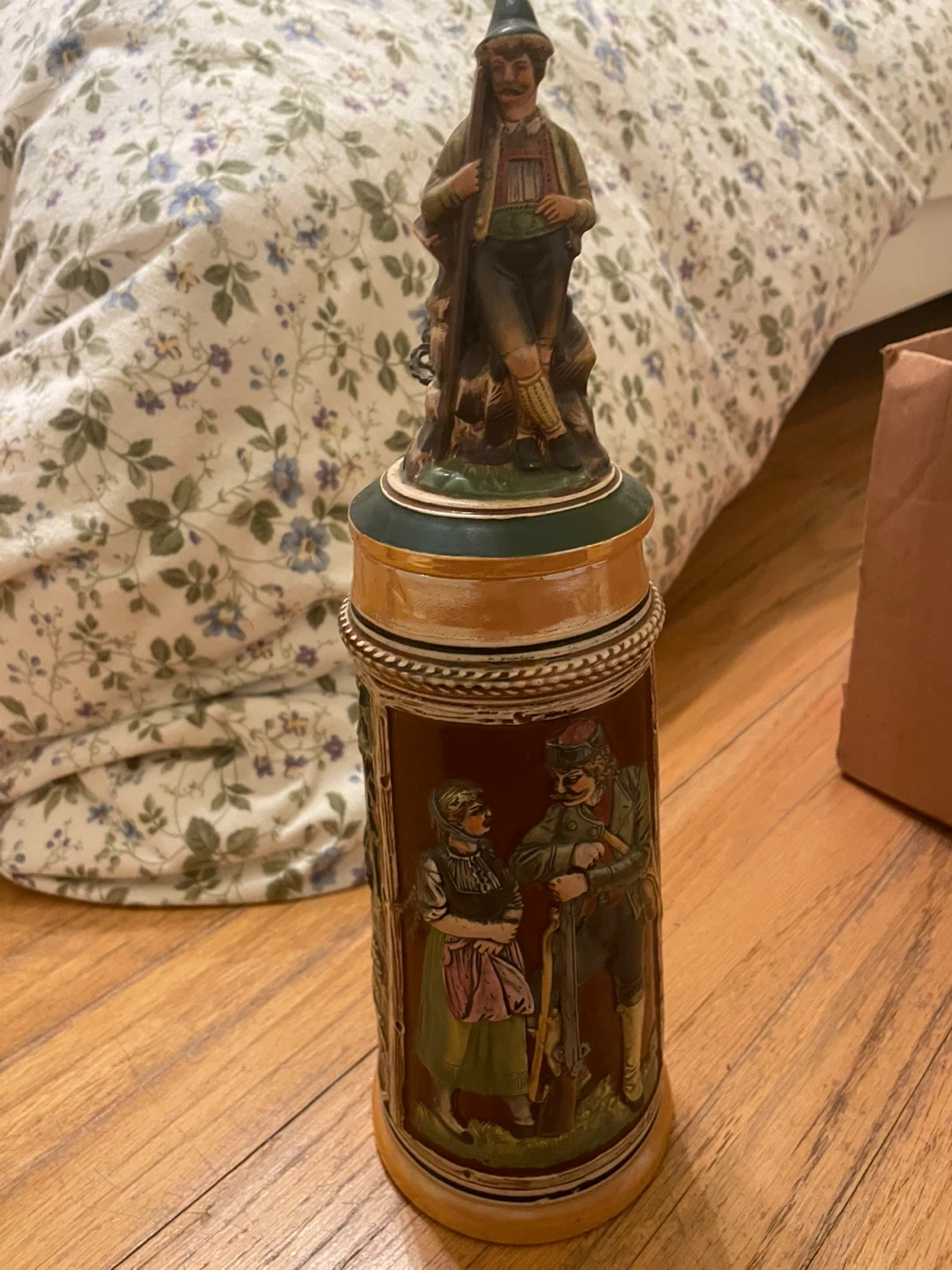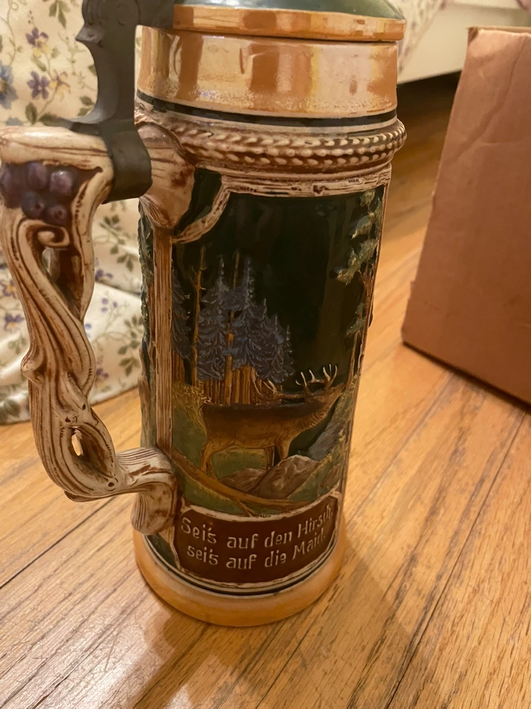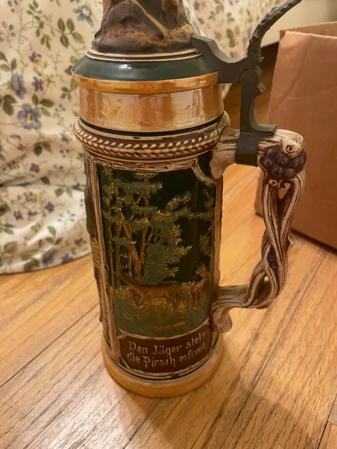 Selling a vintage German beer stein with intricate designs. It depicts scenes of nature, people, and wildlife. Perfect for collectors or as a unique decorative piece. Found at uncles house. Selling to cover funeral expenses