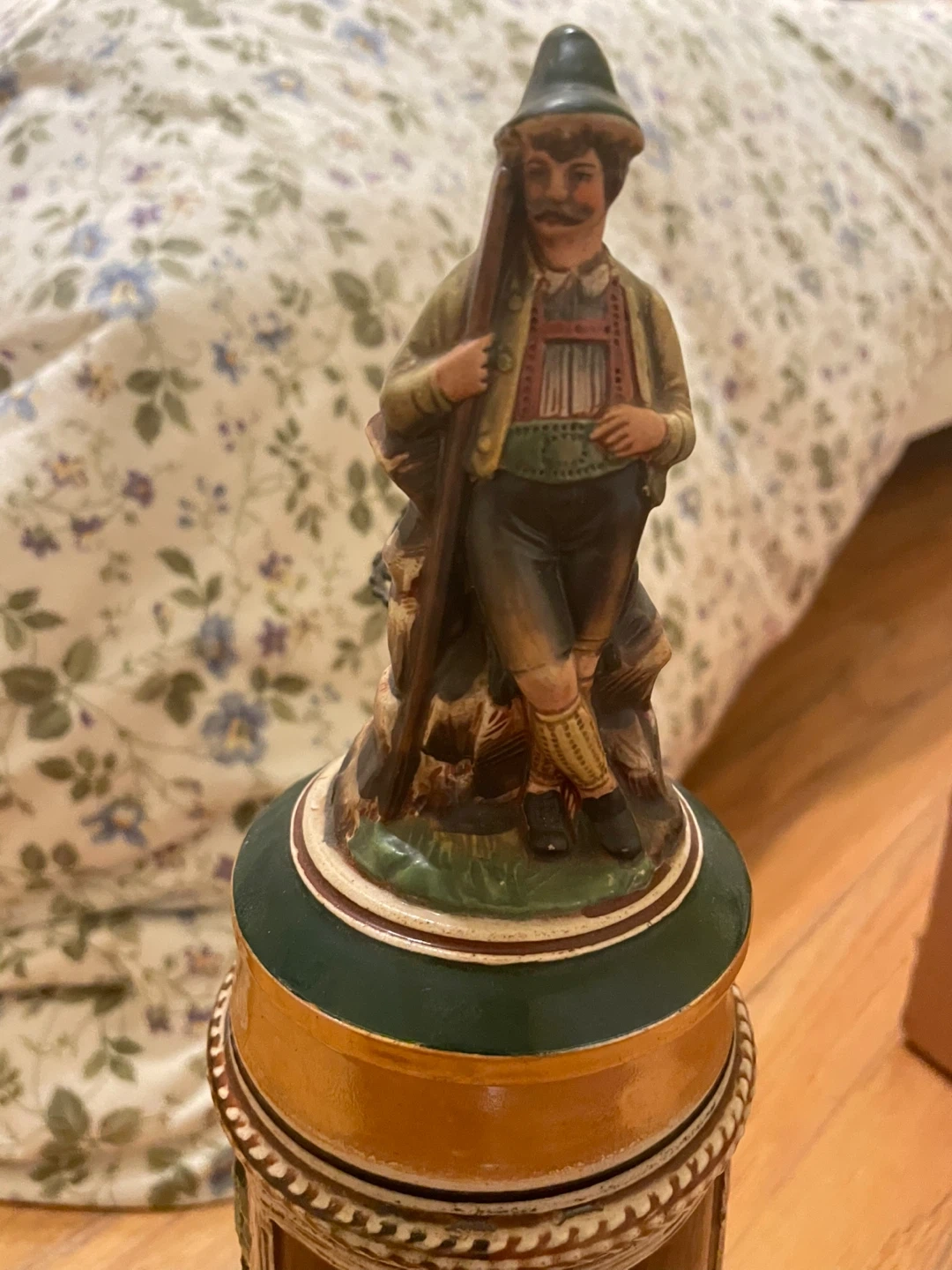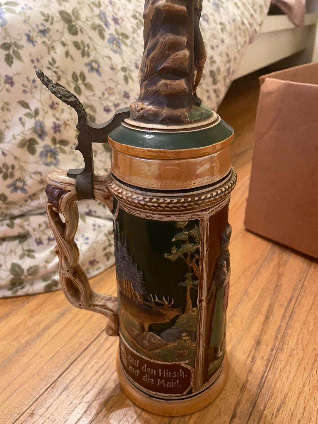 Selling a vintage German beer stein with intricate designs. It depicts scenes of nature, people, and wildlife. Perfect for collectors or as a unique decorative piece. Found at uncles house. Selling to cover funeral expenses